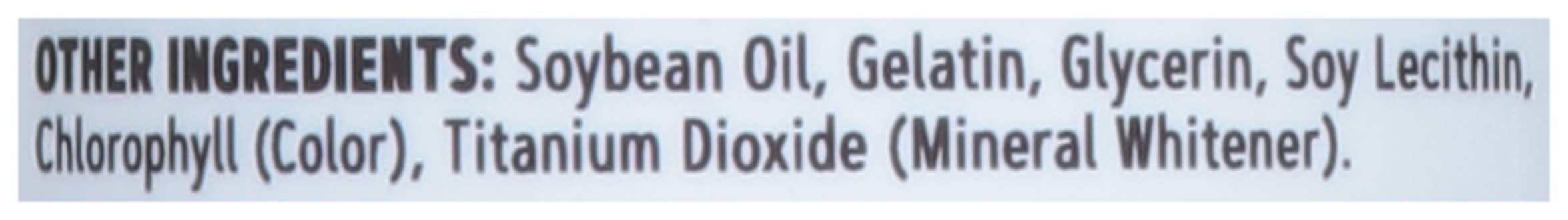 Ingredients: Other Ingredients: Soybean Oil, Gelatin, Glycerin, Soy Lecithin, Chlorophyll (Color), Titanium Dioxide (Mineral Whitener) Contains: Soybeans