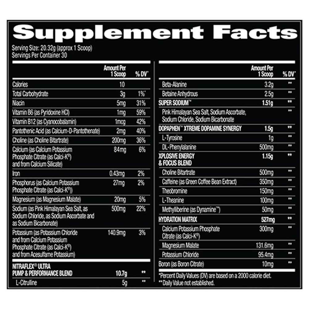 Ingredients: Nitraflex Ultra Pump & Performance Blend: L-Citruline, Beta-Alanine, Betaine Anhydrous, Super Sodium: Pink Himalayan Sea Salt, Sodium Ascorbate, Sodium Chloride, Sodium Bicarbonate, Dopaphen Xtreme Dopamine Synergy: L-Tyrosine, DL-Phenylalanine, Xplosive Energy & Focus Blend: Choline Bitartrate, Caffeine (as Green Coffee Bean Extract), Theobromine, L-Theanine, Methylliberine (as Dynamine), Hydration Matrix: Calcium Potassium Phosphate Citrate (as Calci-K), Magnesium Malate, Potassium Chloride. Other Ingredients: Citric Acid, Natural Flavors, Malic Acid, Silicon Dioxide, Sucralose, Spirulina (Color)