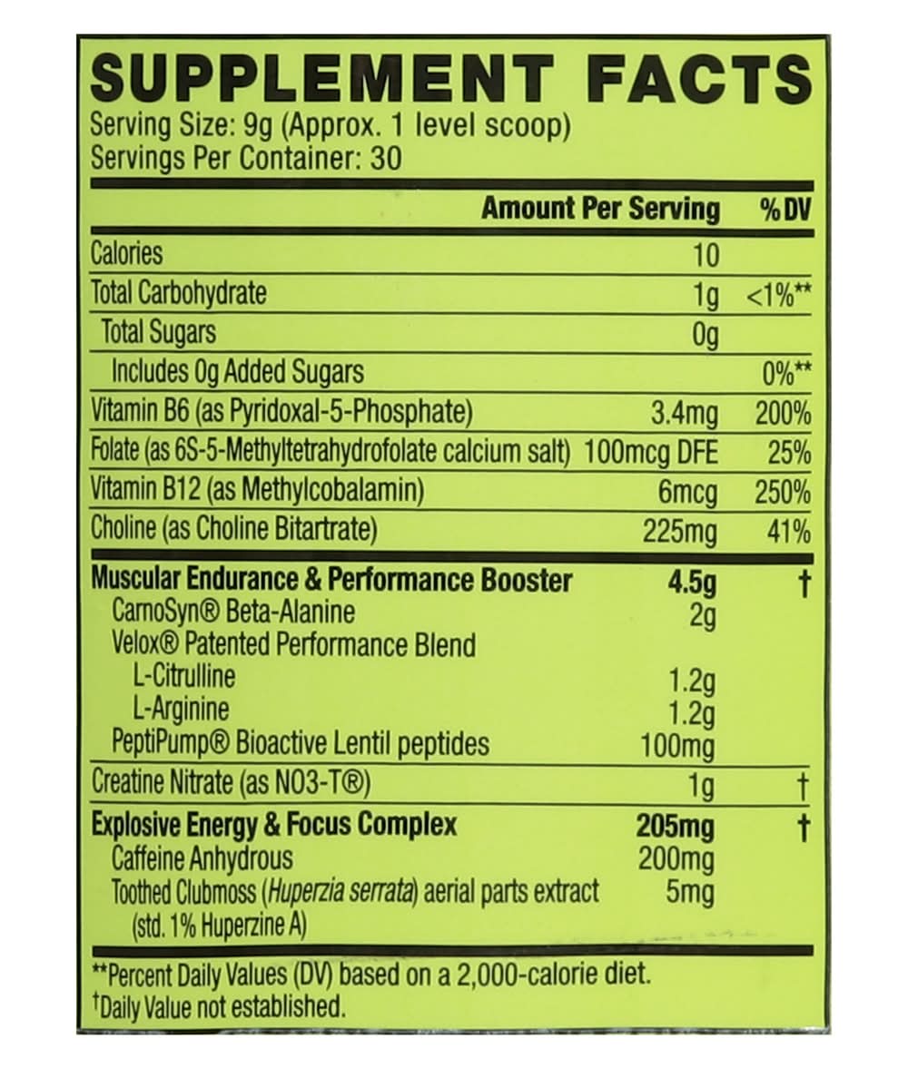 Ingredients: Velox Patented Performance Blend: L-Citrulline, L-Arginine. Other Ingredients: Citric Acid, Silicon Dioxide, Malic Acid, Natural & Artificial Flavors, Calcium Silicate, Sucralose, Acesulfame Potassium, FD&C Red 40
