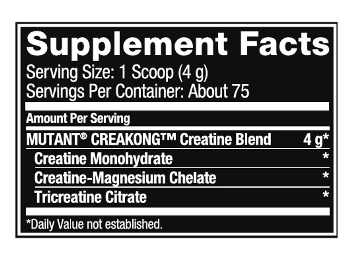 Ingredients: Mutant Creakong Creatine Blend: Creatine Monohydrate, Creatine-Magnesium Chelate, Tricreatine Citrate Contains: Milk, Soybeans, Fish, Tree Nuts, Coconuts