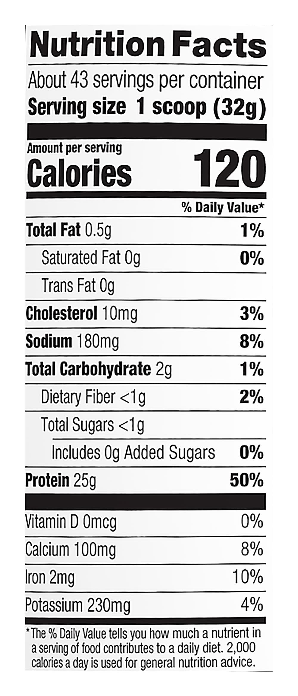 Ingredients: Hydrolyzed Whey Protein Isolate, Whey Protein Isolate, Cocoa Powder (Processed with Alkali), Less than 1% of: Natural and Artificial Flavor, Salt, Potassium Chloride, Soy Lecithin, Sucralose, Steviol Glycosides (Stevia) Contains: Milk, Soybeans