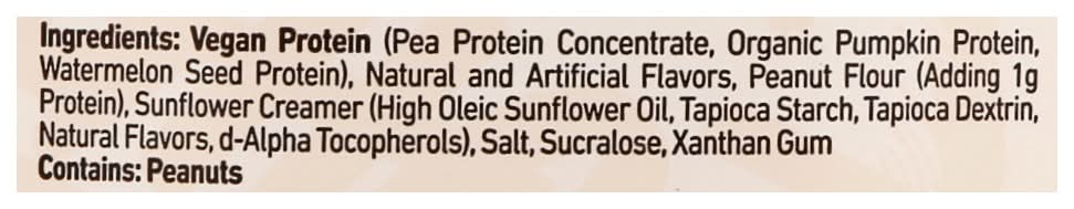Ingredients: Vegan Protein (Pea Protein Concentrate, Organic Pumpkin Protein, Watermelon Seed Protein), Natural and Artificial Flavors, Peanut Flour (Adding 1 g Protein), Sunflower Creamer (High Oleic Sunflower Oil, Tapioca Starch, Tapioca Dextrin, Natural Flavors, D-Alpha Tocopherols), Salt, Sucralose, Xanthan Gum Contains: Peanuts