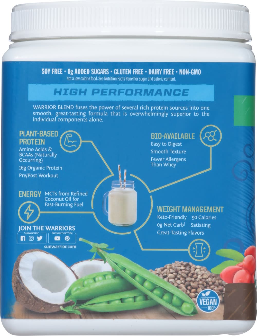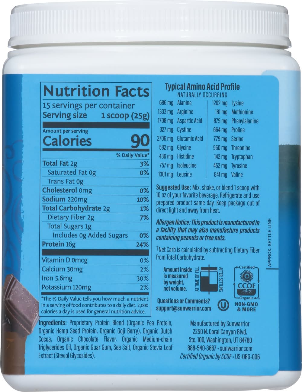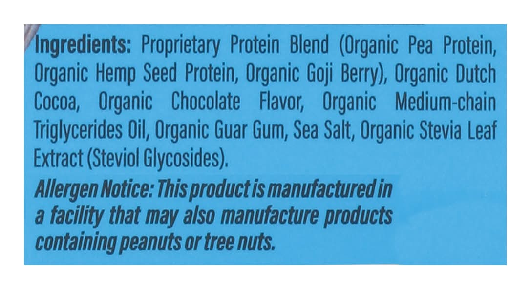 Ingredients: Proprietary Protein Blend (Organic Pea Protein, Organic Hemp Seed Protein, Organic Goji Berry), Organic Dutch Cocoa, Organic Chocolate Flavor, Organic Medium-Chain Triglycerides Oil, Organic Guar Gum, Sea Salt, Organic Stevia Leaf Extract (Steviol Glycosides) Contains: Peanuts, Tree Nuts