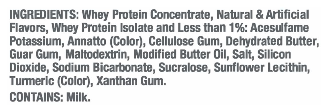 Ingredients: Whey Protein Concentrate, Natural & Artificial Flavors, Whey Protein Isolate and Less than 1%: Acesulfame Potassium, Annatto (Color), Cellulose Gum, Dehydrated Butter, Guar Gum, Maltodextrin, Modified Butter Oil, Salt, Silicon Dioxide, Sodium Bicarbonate, Sucralose, Sunflower Lecithin, Turmeric (Color), Xanthan Gum Contains: Milk