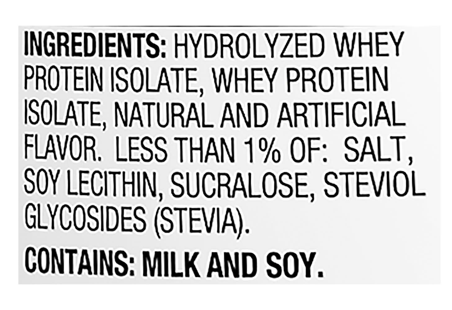 Ingredients: Hydrolyzed Whey Protein Isolate, Whey Protein Isolate, Natural and Artificial Flavor, Less than 1% of: Salt, Soy Lecithin, Sucralose, Steviol Glycosides (Stevia) Contains: Milk, Soybeans