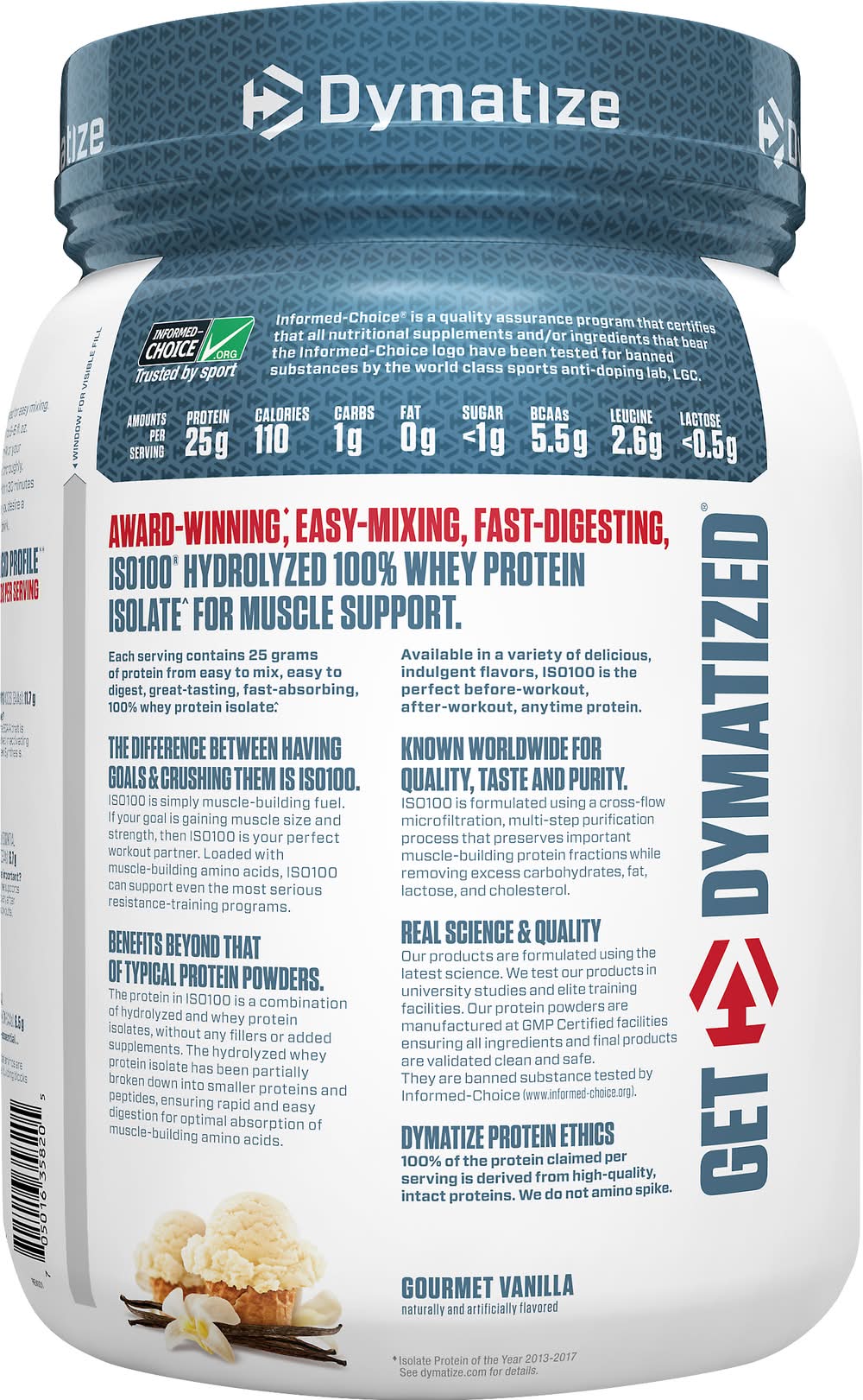 EAAS are necessary for supporting muscle and can only be consumed through diet. Leucine is the BCAA that is directly involved in activating Muscle Protein Synthesis. 53% - 13.4 g Non-EAAS. Non-Essential Amino Acids: Our bodies produce these amino acids naturally and they are beneficial for supporting muscle. Includes Conditionally Essential Amino Acids Glutamine (Includes glutamic acid) 4.4 g – Importance of glutamine: Supports muscle recovery after strenuous workouts. For full amino acid profile, scan code or go to: dymatize.com. 20 servings. Sold by weight not volume. Ultra-fast absorbing performance protein is ideal for those trying to maintain lower body fat, fuel athletic performance, and build lean muscle with a fitness or bodybuilding regimen. Dymatize, the trusted leader in athletic nutrition for over 25 years, brings you ISO100 Hydrolyzed, 100% Whey Protein Isolate Each ultra-fast absorbing and easy digesting serving is scientifically formulated to deliver the protein and amino acids you need for next-level muscle recovery and performance. Engineered to Crush Goals: Building muscle (with a fitness or bodybuilding regimen). Muscle recovery (with a fitness or bodybuilding regimen). Muscle maintenance. Best Times to Use: 0-30 mins. Before training. 0-30 mins. After training. The science behind the scoop. Multi-Step Purification: Fat; Sugar; Lactose; Whey Protein Isolate. ISO100's proteins are filtered to remove excess carbs, cholesterol, fat, sugar, and lactose. Hydrolyzed-Ultra-Fast Absorbing: Protein; Peptide. ISO100's Hydrolyzed Whey Protein Isolate is broken down into smaller protein molecules (peptides). Super Easy Mixing: Mixes completely, even if you use a cup and spoon Banned substance tested. Informed Choice. We test. You trust. informed-choice logo have been tested for banned substances by the world class sports anti-doping lab, LGC. • Flavor: Gourmet vanilla • Size: 1 • Packaging: Reusable