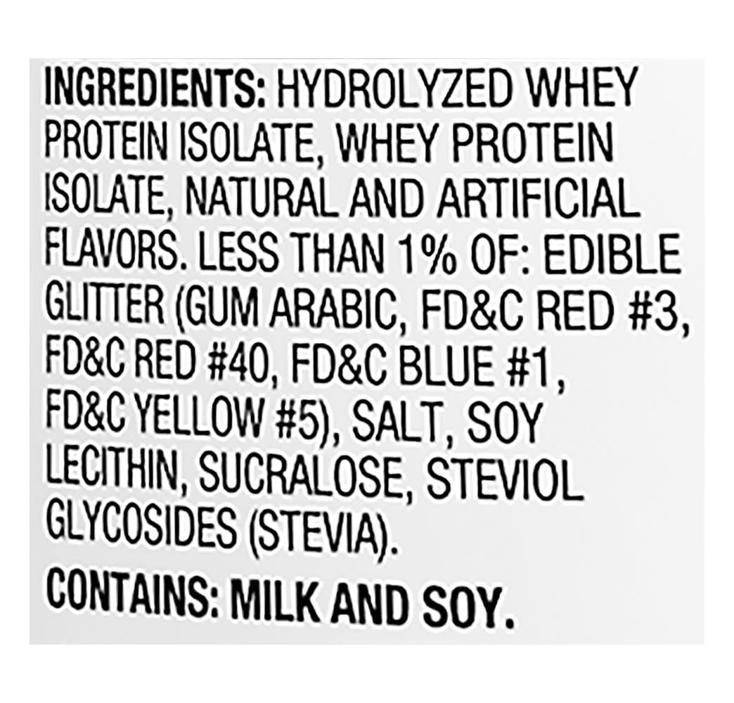 Ingredients: Hydrolyzed Whey Protein Isolate, Whey Protein Isolate, Natural and EArtificial Flavors. Less than 1% of: Edible Glitter (Gum Arabic, FD&C Red No. 3, FD&C Red No. 40, FD&C Blue No.1, FD&C Yellow No. 5), Salt, Soy Lecithin, Sucralose, Steviol Glycosides (Stevia). Contains: Milk, Soybeans