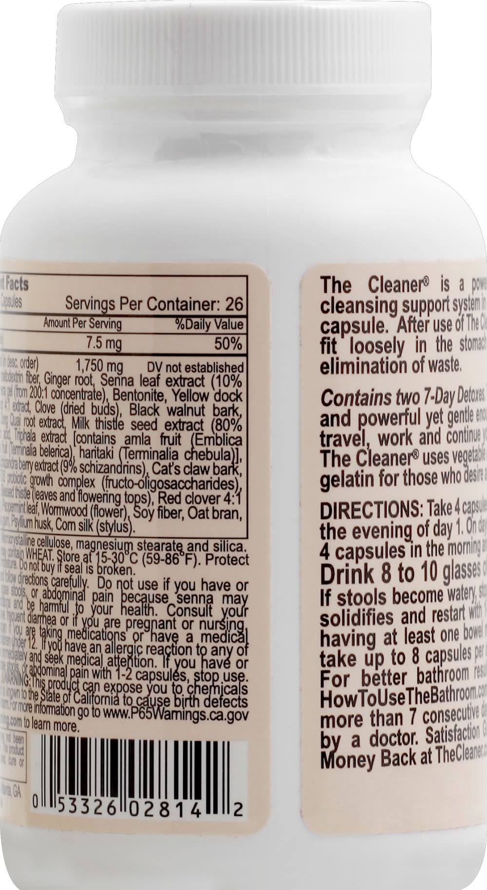 Ingredients: Proprietary Blend: (in Desc, Order) Fibersol-2 Soluble Maltodextrin Fiber, Ginger Root, Senna Leaf Extract (10% Sennosides), Aloe Vera Gel (from 200:1 Concentrate), Bentonite, Yellow Dock Root, Dandelion Root 4.1 Extract, Clove (Dried Buds), Black Walnut Bark, Chastetree Berry, Dong Quai Root Extract, Milk Thistle Seed Extract (80% Silymarin), Caprylic Acid, Triphala Extract [Contains Amla Fruit (Emblica Officinalis), Bibhitaki Fruit (Terminalia Belerica), Haritaki (Terminalia Chebula)], Elecampane Root, Schizandra Berry Extract (9% Schizandrins), Cat's Claw Bark, Calcium Citrate, Fos Probiotic Growth Complex (Fructo-Oligosaccharides) Magnesium Citrate, Blessed Thistle (Leaves and Flowering Tops) Red Clover 4:1 Extract (Aerial Parts), Peppermint Leaf, Wormwood (Flower), Soy Fiber, Oat Bran, Apple Pectin, Acacia Gum, Psyllium Husk, Corn Silk (Stylus). Other Ingredients: Microcrystalline Cellulose, Magnesium Stearate, Silica Contains: Milk, Tree Nuts, Soybeans, Wheat