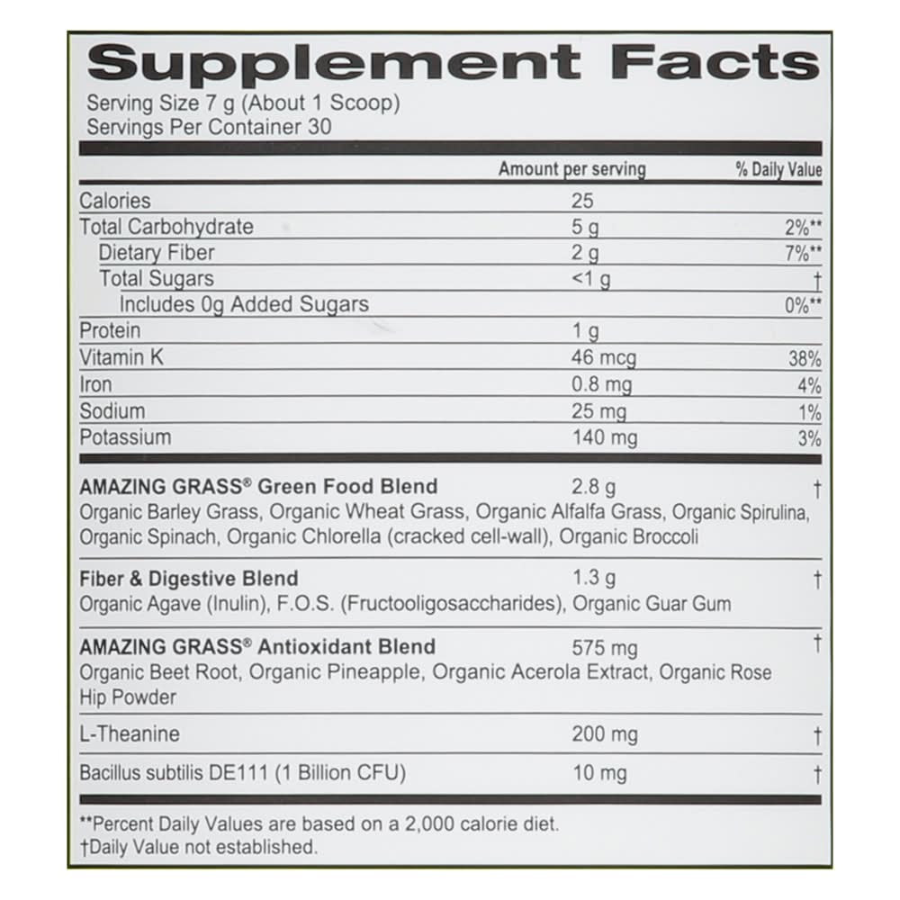 Ingredients: Amazing Grass Green Food Blend: Organic Barley Grass, Organic Wheat Grass, Organic Alfalfa Grass, Organic Spirulina, Organic Spinach, Organic Chlorella (Cracked Cell-Wall), Organic Broccoli, Fiber & Digestive Blend: Organic Agave (Inulin), F, O, S, (Fructooligosaccharides), Organic Guar Gum, Amazing Grass Antioxidant Blend: Organic Beet Root, Organic Pineapple, Organic Acerola Extract, Organic Rose Hip Powder. Other Ingredients: Natural Flavor, Citric Acid, Silicon Dioxide, Organic Monk Fruit Extract Contains: Wheat, Barley