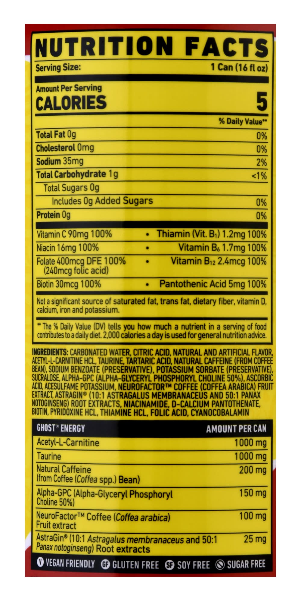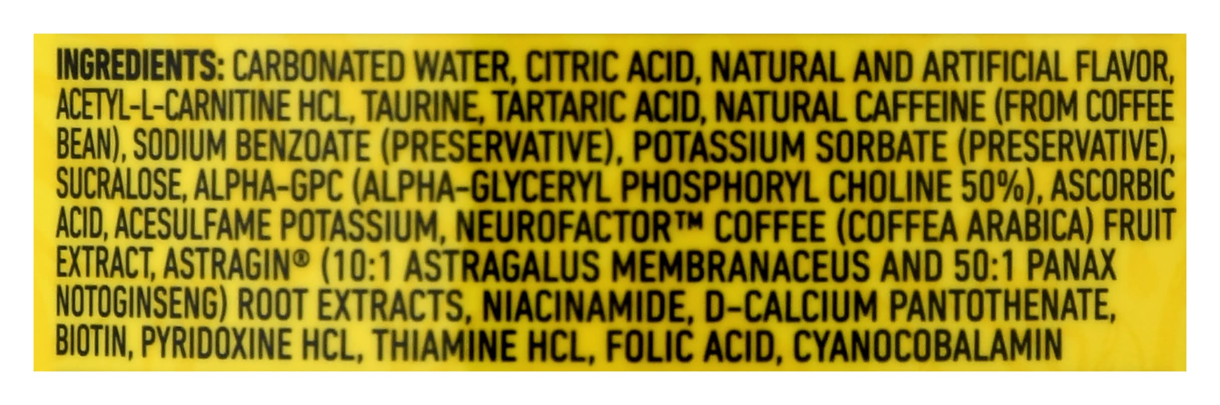 Ingredients: Carbonated Water, Citric Acid, Natural and Artificial Flavor, Acetyl-L-Carnitine HCl, Taurine, Tartaric Acid, Natural Caffeine (from Coffee Bean), Sodium Benzoate (Preservative), Potassium Sorbate (Preservative) Sucralose, Alpha-Gpc (Alpha-Glyceryl Phosphoryl Choline 50%), Ascorbic Acid, Acesulfame Potassium, Neurofactor Coffee (Coffee Arabica) Fruit Extract, Astragin (10:1 Astragalus Membranaceus and 50:1 Panax Notoginseng) Root Extract, Niacinamide, D-Calcium Pantothenate, Biotin, Pyridoxine HCl, Thiamine HCl, Folic Acid, Cyanocobalamin