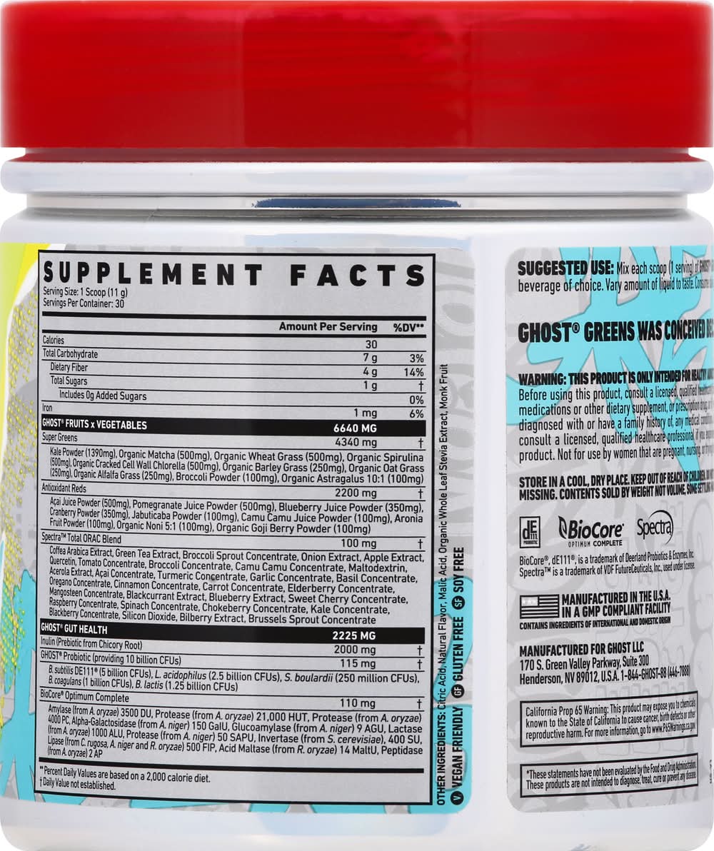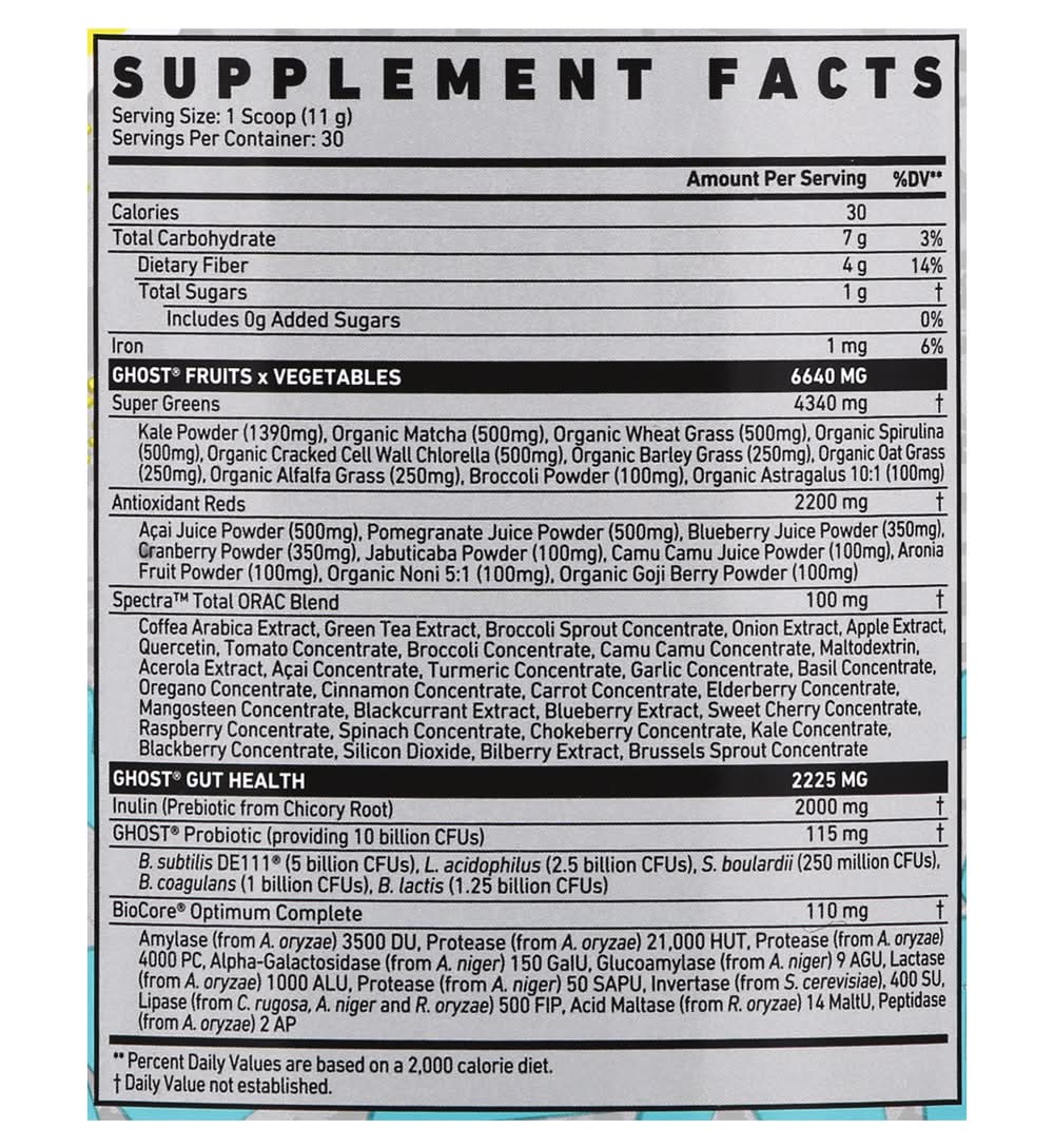 Ingredients: Super Greens: Kale Powder (1930 mg), Organic Matcha (500 mg), Organic Wheat Grass (500 mg), Organic Spirulina (500 mg), Organic Cracked Cell Wall Chlorella (500 mg), Organic Barley Grass (250 mg), Organic Oat Grass (250 mg), Organic Alfalfa Grass (250 mg), Broccoli Powder (100 mg), Organic Astralagus 10:1 (100 mg). Antioxidant Reds: Acai Juice Powder (500 mg), Pomegranate Juice Powder (500 mg), Blueberry Juice Powder (350 mg), Cranberry Powder (350 mg), Jabuticaba Powder (100 g), Camu Camu Juice Powder (100 mg), Aronia Fruit Powder (100 mg), Organic Noni 5:1 (100 mg), Organic Goji Berry Powder (100 mg). Spectra Total ORAC Blend: Coffee Arabica Extract, Green Tea Extract, Broccoli Sprout Concentrate, Onion Extract, Apple Extract, Quercetin, Tomato Concentrate, Broccoli Concentrate, Camu Camu Concentrate, Maltodextrin, Acerola Extract, Aca Concentrate, Turmeric Concentrate, Garlic Concentrate, Basil Concentrate, Oregano Concentrate, Cinnamon Concentrate, Carrot Concentrate, Elderberry Concentrate, Mangosteen Concentrate, Blackcurrant Extract, Blueberry Extract, Sweet Cherry Concentrate, Raspberry Concentrate, Spinach Concentrate, Chokeberry Concentrate, Kale Concentrate, Blackberry Concentrate, Silicon Dioxide, Bilberry Extract, Brussels Sprout Concentrate. Ghost Probiotic (Providing 10 Billion CFUs): B. Subtilis DE111 (5 Billion CFUs), L. Acidophilus (2.5 Billion CFUs), S. Boulardii (250 Million CFUs), B. Coagulans (1 Billion CFUs), B. Lactis (1.25 Billion CFUs). BioCore Optimum Complete: Amylase (from A. Oryzae) 3500 DU, Protease (from A. Oryzae) 21, 000 HUT, Protease (from A. Oryzae) 4000 PC, Alpha-Galactosidase (from A. Niger) 150 GalU, Glucoamylase (from A. Niger), 9 AGU, Lactase (from A. Oryzae) 1000 ALU, Protease (from A. Niger) 50 SAPU, Invertase (from S. Cerevisiae) 400 SU, Lipase (C. Rugosa, A. Niger and R. Oryzae) 500 FIP, Acid Maltase (from R. Oryzae) 14 MaltU, Peptidase (from A. Oryzae) 2 AP. Other Ingredients: Citric Acid, Natural Flavor, Malic Acid, Organic Whole Leaf Stevia Extract, Monk Fruit