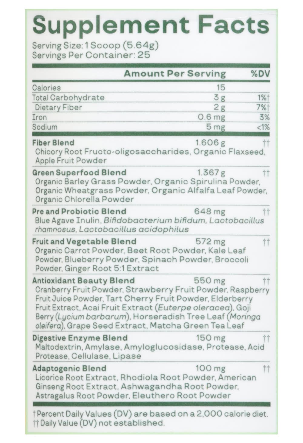 Ingredients: Organic Flaxseed, Apple Fruit Powder, Green Superfood Blend: Organic Barley Grass Powder, Organic Spirulina Powder, Organic Wheatgrass Powder, Organic Alfalfa Leaf Powder, Organic Chlorella Powder, Pre and Probiotic Blend: Blue Agave Inulin, Bifidobacterium Bifidum, Lactobacillus Rhamnosus, Lactobacillus Acidophilus, Fruit and Vegetable Blend: Organic Carrot Powder, Beet Root Powder, Kale Leaf Powder, Blueberry Powder, Spinach Powder, Broccoli Powder, Ginger Root 5:1 Extract, Antioxidant Beauty Blend: Cranberry Fruit Powder, Strawberry Fruit Powder, Raspberry Fruit Juice Powder, Tart Cherry Fruit Powder, Elderberry Fruit Extract, Acai Fruit Extract (Euterpe Oleracea), Goji Berry (Lycium Barbarum), Horseradish Tree Leaf (Moringa Oleifera), Grape Seed Extract, Matcha Green Tea Leaf, Digestive Enzyme Blend: Maltodextrin, Amylase, Amyloglucosidase, Protease, Acid Protease, Cellulase, Lipase, Adaptogenic Blend: Licorice Root Extract, Rhodiola Root Powder, American Ginseng Root Extract, Ashwagandha Root Powder, Astragalus Root Powder, Eleuthero Root Powder. Other Ingredients: Natural Flavors, Citric Acid, Stevia Leaf Extract (Reb a) Contains: Barley, Wheat