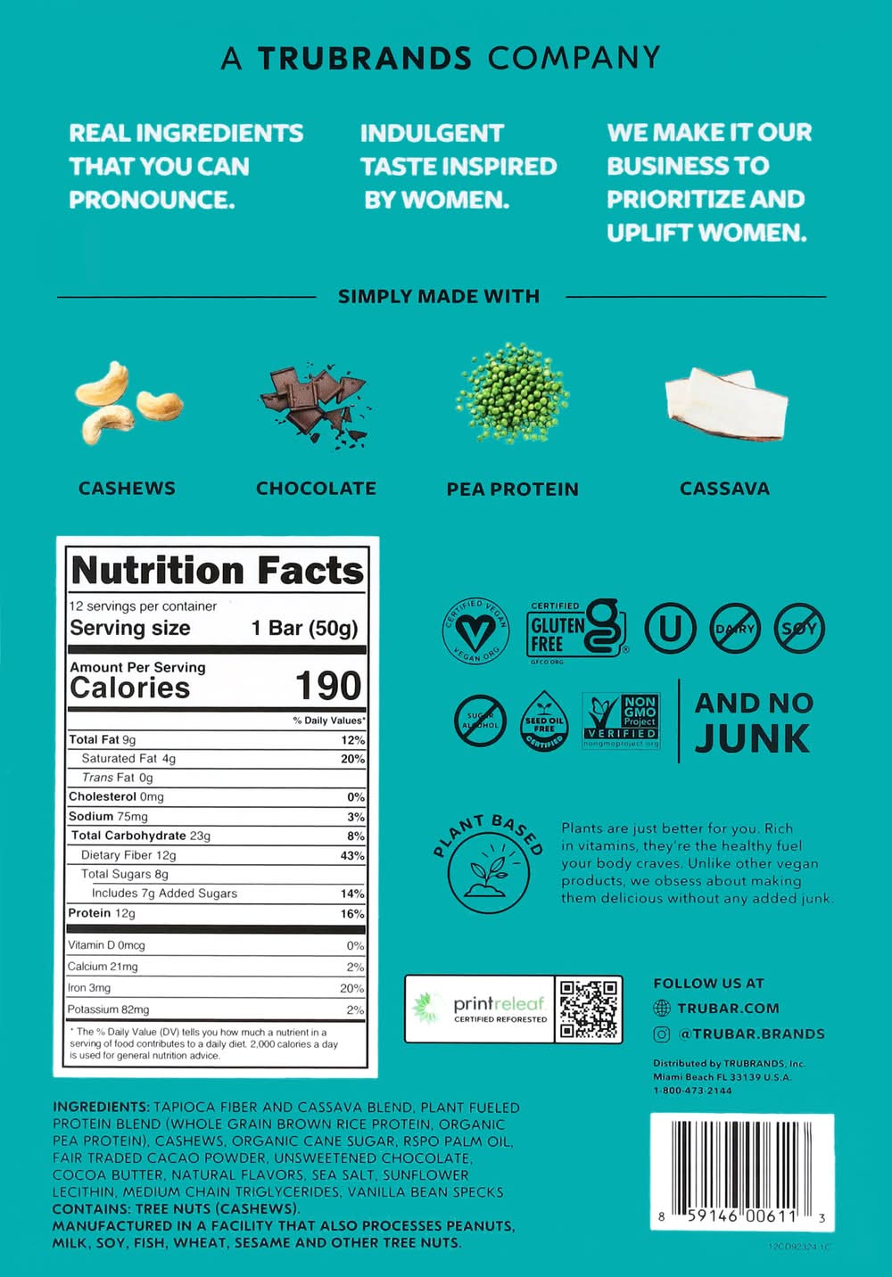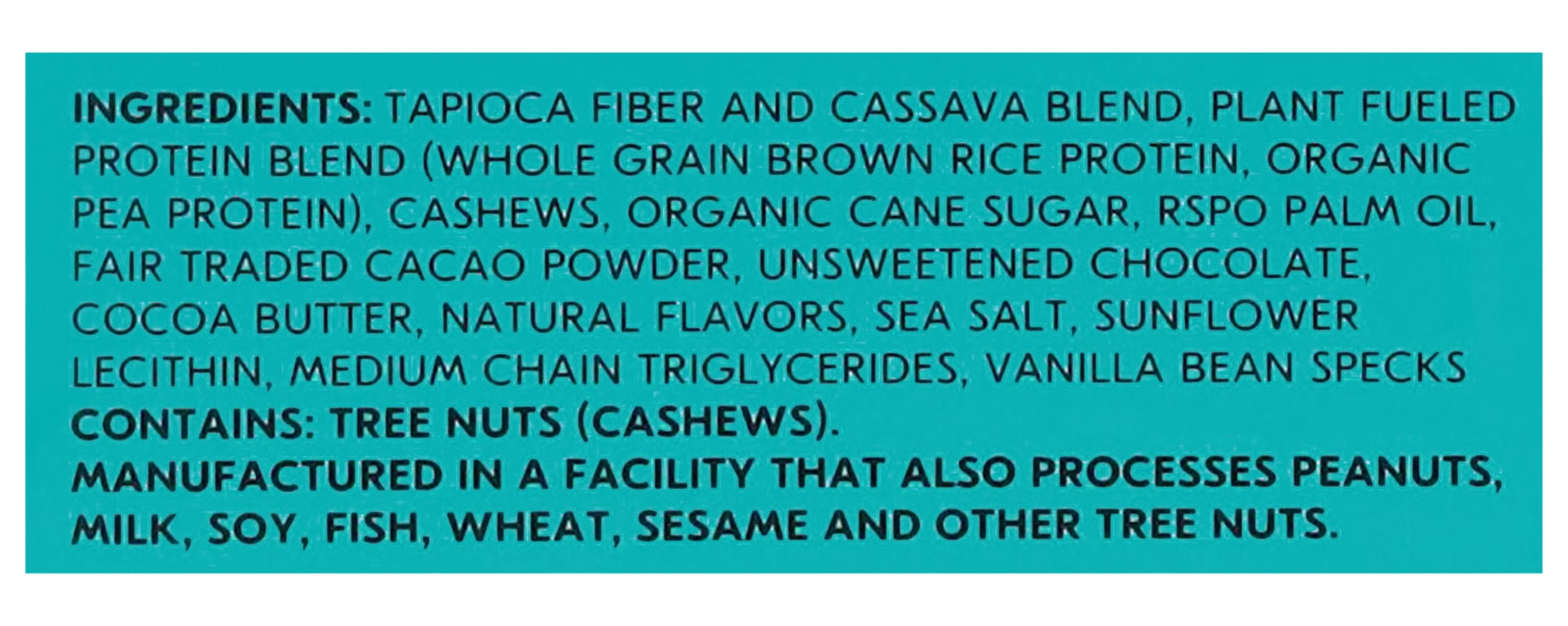 Ingredients: Tapioca Fiber and Cassava Blend, Plant Fueled Protein Blend (Whole Grain Brown Rice Protein, Organic Pea Protein), Cashews, Organic Cane Sugar, RSPO Palm Oil, Fair Traded Cacao Powder, Unsweetened Chocolate, Cocoa Butter, Natural Flavors, Sea Salt, Sunflower Lecithin, Medium Chain Triglycerides, Vanilla Bean Specks Contains: Tree Nuts, Cashews, Tree Nuts, Peanuts, Milk, Soybeans, Crustacean Shellfish, Wheat, Sesame, Tree Nuts