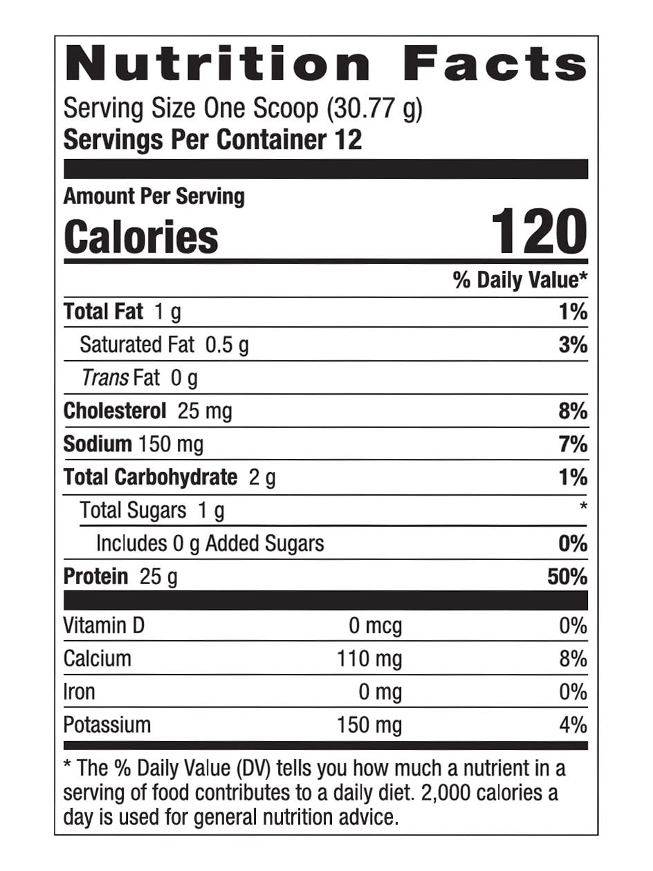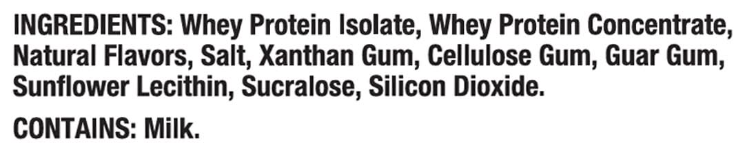 Ingredients: Whey Protein Isolate, Whey Protein Concentrate, Natural Flavors, Salt, Xanthan Gum, Cellulose Gum, Guar Gum, Sunflower Lecithin, Sucralose, Silicon Dioxide Contains: Milk