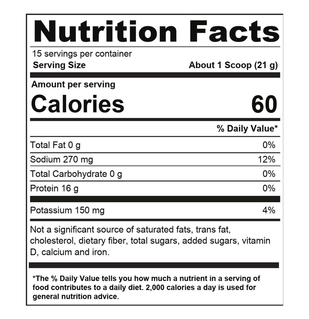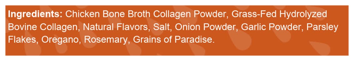 Ingredients: Chicken Bone Broth Collagen Powder, Grass-Fed Hydrolyzed Bovine Collagen, Natural Flavors, Salt, Onion Powder, Garlic Powder, Parsley Flakes, Oregano, Rosemary, Grains of Paradise