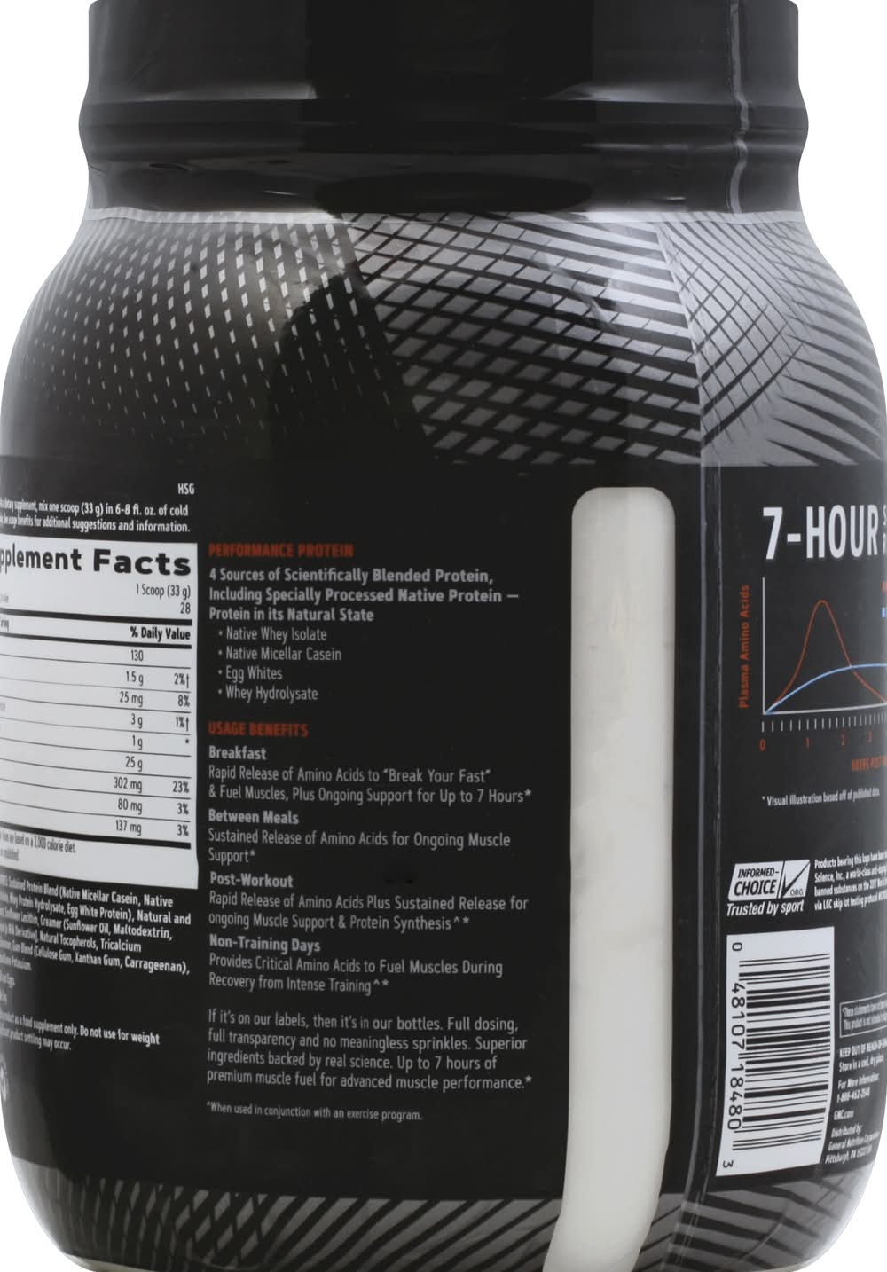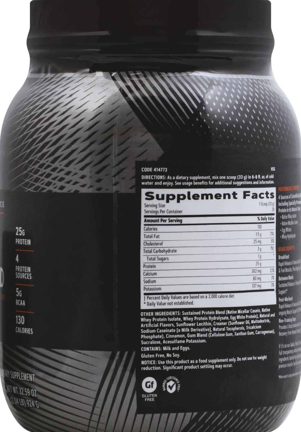 Ingredients: Other Ingredients: Sustained Protein Blend (Native Micellar Casein, Native Whey Protein Isolate, Whey Protein Hydrolysate, Egg White Protein), Natural and Artificial Flavors, Sunflower Lecithin, Creamer (Sunflower Oil, Maltodextrin, Sodium Caseinate [a Milk Derivative], Natural Tocopherols, Tricalcium Phosphate), Cinnamon, Gum Blend (Cellulose Gum, Xanthan Gum, Carrageenan), Sucralose, Acesulfame Potassium Contains: Eggs, Milk