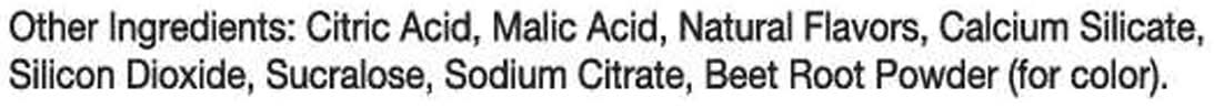 Ingredients: Other Ingredients: Citric Acid, Malic Acid, Natural Flavors, Calcium Silicate, Silicon Dioxide, Sucralose, Sodium Citrate, Beet Root Powder (for Color)