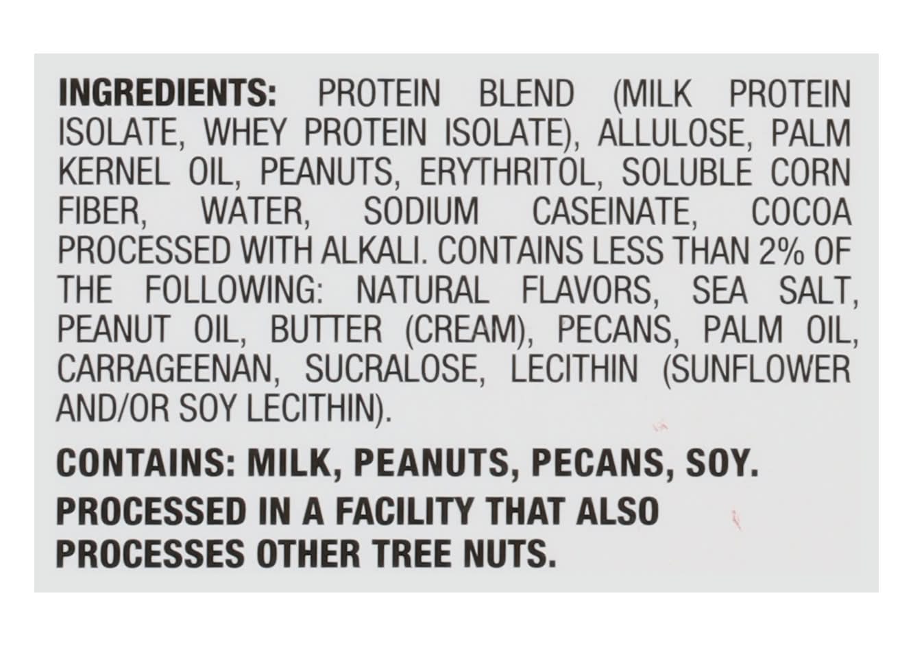Ingredients: Protein Blend (Milk Protein Isolate, Whey Protein Isolate), Allulose, Palm Kernel Oil, Peanuts, Erythritol, Soluble Corn Fiber, Water, Sodium Caseinate, Cocoa Processed with Alkali. Contains Less than 2% of the Following: Natural Flavors, Sea Salt, Peanut Oil, Butter (Cream), Pecans, Palm Oil, Carrageenan, Sucralose, Lecithin (Sunflower and/or Soy Lecithin) Contains: Milk, Peanuts, Tree Nuts, Pecans, Soybeans, Tree Nuts