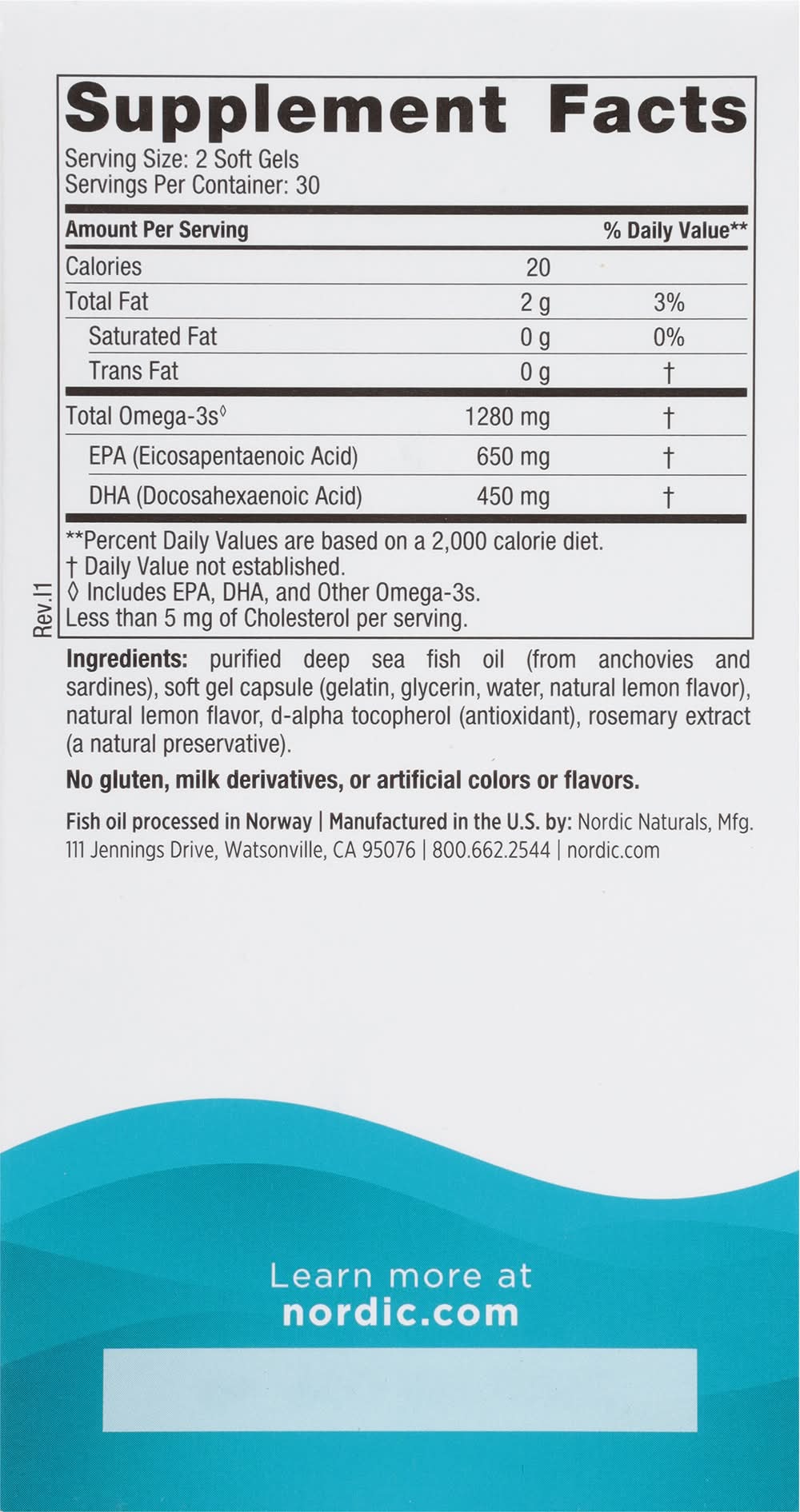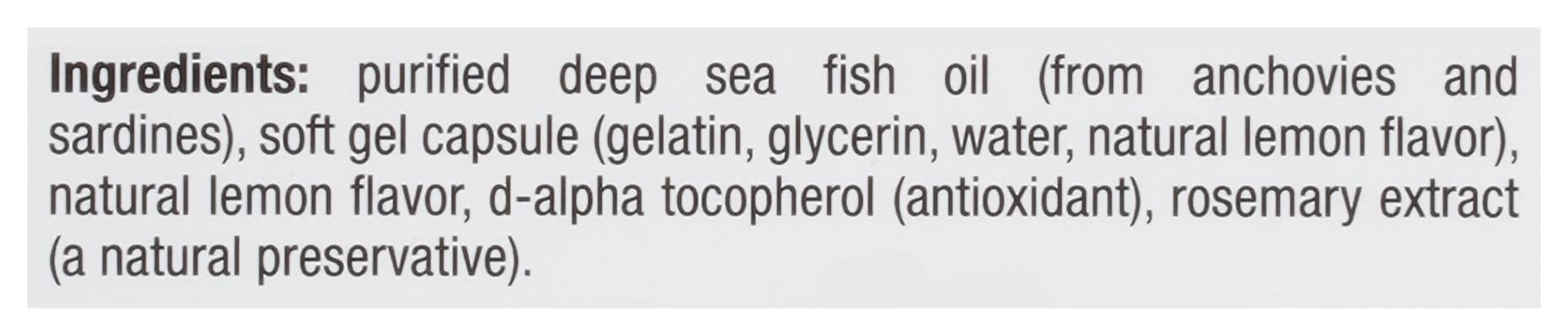 Ingredients: Purified Deep Sea Fish Oil (from Anchovies and Sardines), Soft Gel Capsule (Gelatin Glycerin Water Natural Lemon Flavor), Natural Lemon Flavor, D-Alpha Tocopherol (Antioxidant), Rosemary Extract (a Natural Preservative) Contains: Fish