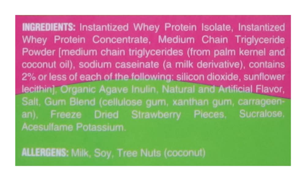 Ingredients: Instantized Whey Protein Isolate, Instantized Whey Protein Concentrate, Medium Chain Triglyceride Powder [Medium Chain Triglycerides (from Palm Kernel and Coconut Oil), Sodium Caseinate (a Milk Derivative), Contains 2% or Less of Each of the Following: Silicon Dioxide, Sunflower Lecithin], Organic Agave Inulin, Natural and Artificial Flavor, Salt, Gum Blend (Cellulose Gum, Xanthan Gum, Carrageenan), Freeze Dried Strawberry Pieces, Sucralose, Acesulfame Potassium Contains: Milk, Soybeans, Tree Nuts, Coconuts