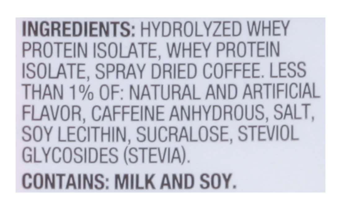 Ingredients: Hydrolyzed Whey Protein Isolate, Whey Protein Isolate, Spray Dried Coffee, Less than 1% of: Natural and Artificial Flavor, Caffeine Anhydrous, Salt, Soy Lecithin, Sucralose, Steviol Glycosides (Stevia) Contains: Milk, Soybeans