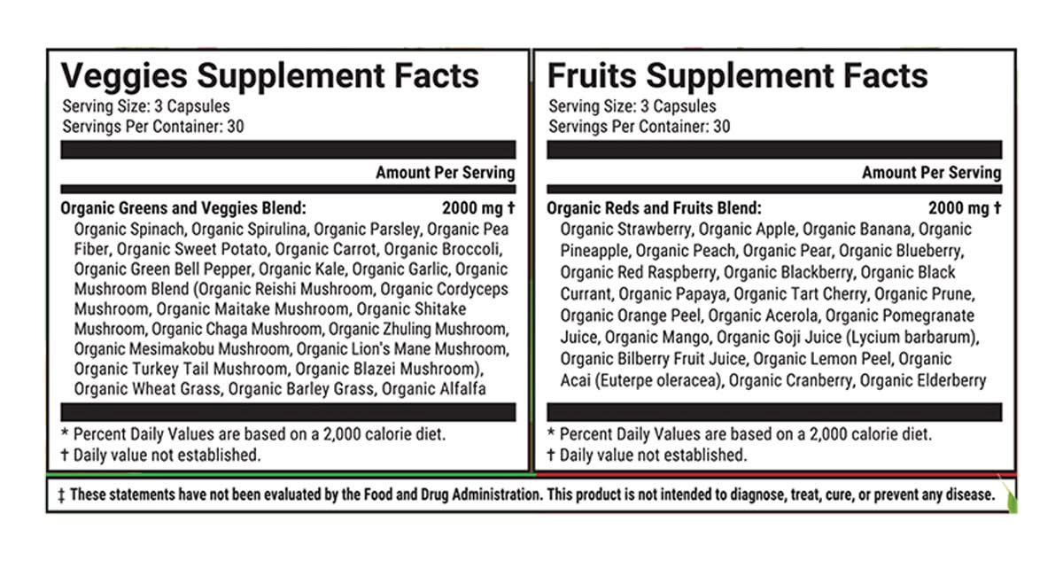 Ingredients: Super Veggies: Organic Greens and Veggies Blend: Organic Spinach, Organic Spirulina, Organic Parsley, Organic Pea Fiber, Organic Sweet Potato, Organic Carrot, Organic Broccoli, Organic Green Bell Pepper, Organic Kale, Organic Garlic, Organic Mushroom Blend (Organic Reishi Mushroom, Organic Cordyceps Mushroom, Organic Maitake Mushroom, Organic Shitake Mushroom, Organic Chaga Mushroom, Organic Zhuling Mushroom, Organic Mesimakobu Mushroom, Organic Lion's Mane Mushroom, Organic Turkey Tail Mushroom, Organic Blazei Mushroom), Organic Wheat Grass, Organic Barley Grass, Organic Alfalfa. Other Ingredients: Hypromellose. Super Fruits: Organic Reds and Fruits Blend: Organic Strawberry, Organic Apple, Organic Banana, Organic Pineapple, Organic Peach, Organic Pear, Organic Blueberry, Organic Red Raspberry, Organic Blackberry, Organic Black Currant, Organic Papaya, Organic Tart Cherry, Organic Prune, Organic Orange Peel, Organic Acerola, Organic Pomegranate Juice, Organic Mango, Organic Goji Juice (Lycium Barbarum), Organic Bilberry Fruit Juice, Organic Lemon Peel, Organic Acai (Euterpe Oleracea), Organic Cranberry, Organic Elderberry. Other Ingredients: Hypromellose Contains: Wheat, Barley