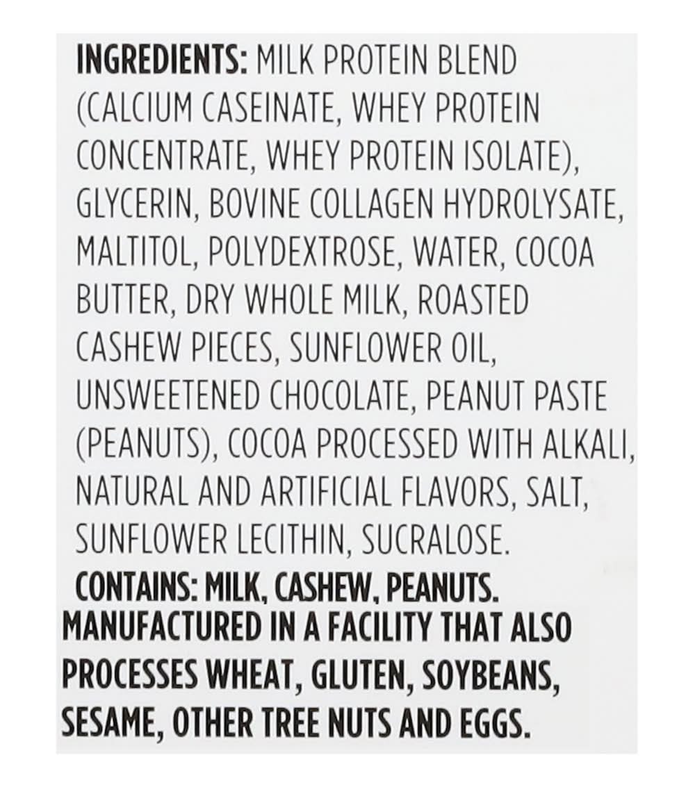 Ingredients: Milk Protein Blend (Calcium Caseinate, Whey Protein Concentrate, Whey Protein Isolate), Glycerin, Bovine Collagen Hydrolysate, Maltitol, Polydextrose, Water, Cocoa Butter, Dry Whole Milk, Roasted Cashew Pieces, Sunflower Oil, Unsweetened Chocolate, Peanut Paste (Peanuts), Cocoa Processed with Alkali, Natural and Artificial Flavors, Salt, Sunflower Lecithin, Sucralose Contains: Milk, Tree Nuts, Cashews, Peanuts, Wheat, Gluten, Sesame, Tree Nuts, Eggs, Soybeans