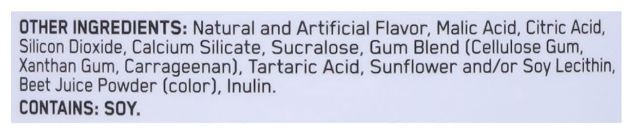 Ingredients: Other Ingredients: Natural and Artificial Flavor, Malic Acid, Citric Acid, Silicon Dioxide, Calcium Silicate, Sucralose, Gum Blend (Cellulose Gum, Xanthan Gum, Carrageenan), Tartaric Acid, Sunflower and/or Soy Lecithin, Beet Juice Powder (Color), Inulin. Amino Blend: Micronized Taurine, Micronized L-Glutamine, Micronized L-Arginine, Micronized L-Leucine, Beta-Alanine, Micronized L-Citrulline, Micronized L-Isoleucine, Micronized L-Valine, Micronized L-Tyrosine, Micronized L-Histidine, Micronized L-Lysine Hydrochloride, Micronized L-Phenylalanine, Micronized L-Threonine, Micronized L-Methionine Contains: Soybeans