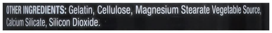 Ingredients: Other Ingredients: Gelatin, Cellulose, Magnesium Stearate Vegetable Source, Calcium Silicate, Silicon Dioxide