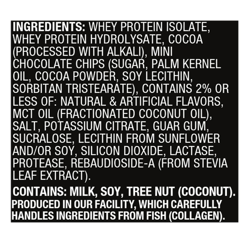 Ingredients: Whey Protein Isolate, Whey Protein Hydrolysate, Cocoa (Processed with Alkali), Mini Chocolate Chips (Sugar, Palm Kernel Oil, Cocoa Powder, Soy Lecithin, Sorbitan Tristearate), Contains 2% or Less of: Natural & Artificial Flavors, MCT Oil (Fractionated Coconut Oil), Salt, Potassium Citrate, Guar Gum, Sucralose, Lecithin from Sunflower and/or Soy, Silicon Dioxide, Lactase, Protease, Rebaudioside-A (from Stevia Leaf Extract) Contains: Milk, Soybeans, Tree Nuts, Coconuts, Tree Nuts, Fish