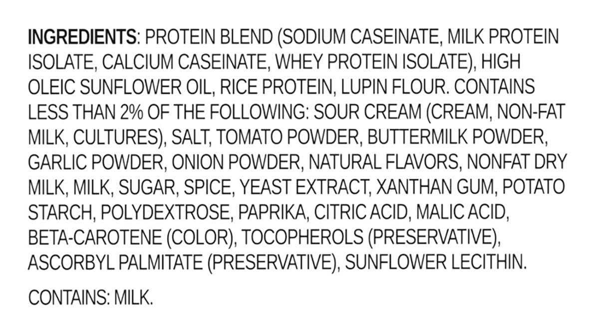 Ingredients: Protein Blend (Sodium Caseinate, Milk Protein Isolate, Calcium Caseinate, Whey Protein Isolate), High Oleic Sunflower Oil, Rice Protein, Lupin Flour, Contains Less than 2% of the Following: Sour Cream (Cream, Non-Fat Milk, Cultures), Salt, Tomato Powder, Buttermilk Powder, Garlic Powder, Onion Powder, Natural Flavors, Nonfat Dry Milk, Milk, Sugar, Spice, Yeast Extract, Xanthan Gum, Potato Starch, Polydextrose, Paprika, Citric Acid, Malic Acid, Beta-Carotene (Color), Tocopherols (Preservative), Ascorbyl Palmitate (Preservative), Sunflower Lecithin Contains: Milk