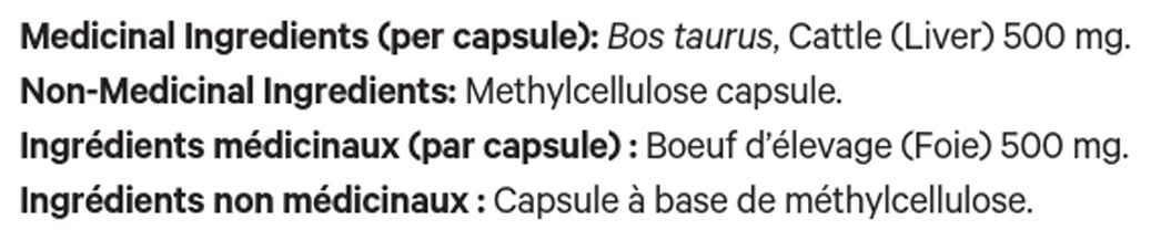 Ingredients: Medicinal Ingredients (per Capsule): Bos Taurus, Cattle (Liver) 500 mg. Non-Medicinal Ingredients: Methylcellulose Capsule