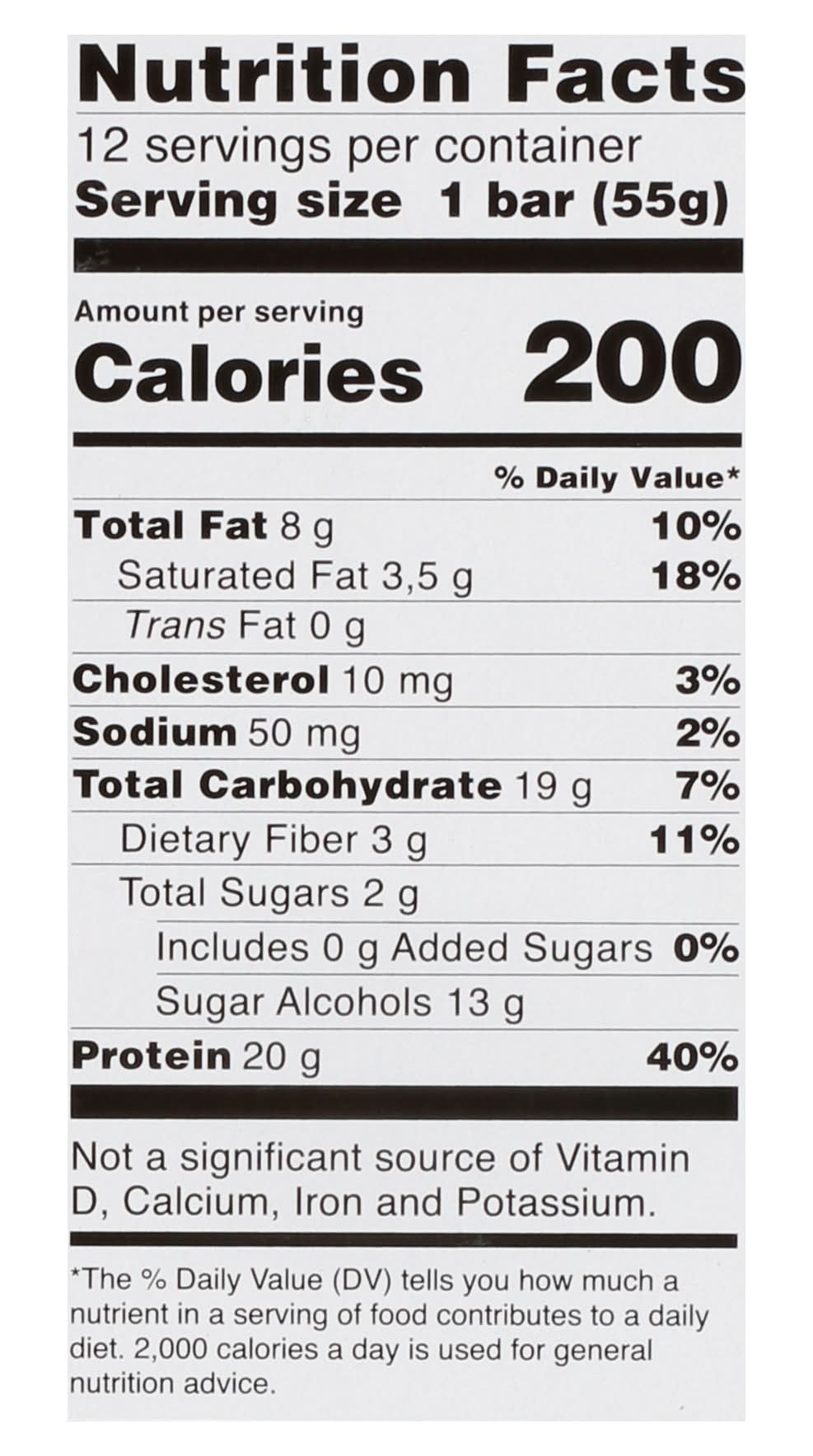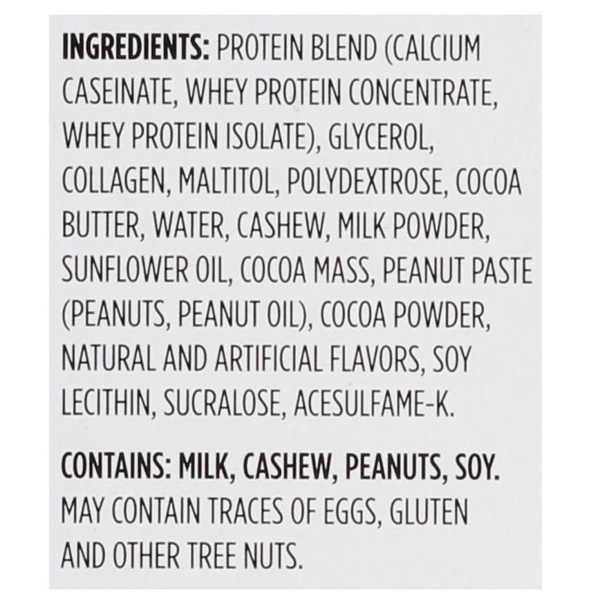 Ingredients: Protein Blend (Calcium Caseinate, Whey Protein Concentrate, Whey Protein Isolate), Glycerol, Maltitol, Collagen, Polydextrose, Soy Crisp (Soy Protein Isolate, Cocoa Powder, Tapioca Starch), Cocoa Butter, Water, Milk Powder, Sunflower Oil, Cocoa Mass, Natural and Artificial Flavors, Soy Lecithin, Sucralose, Acesulfame-K Contains: Milk, Soybeans, Peanuts, Tree Nuts, Eggs, Gluten
