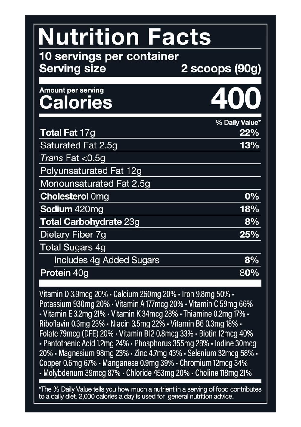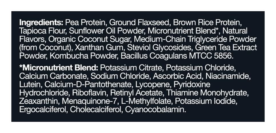 Ingredients: Pea Protein, Ground Flaxseed, Brown Rice Protein, Tapioca Flour, Sunflower Oil Powder, Micronutrient Blend*, Natural Flavors, Organic Coconut Sugar, Medium-Chain Triglyceride Powder (from Coconut), Xanthan Gum, Steviol Glycosides, Green Tea Extract Powder, Kombucha Powder, Bacillus Coagulans MTCC 5856. * Micronutrient Blend: Potassium Citrate, Potassium Chloride, Calcium Carbonate, Sodium Chloride, Ascorbic Acid, Niacinamide, Lutein, Calcium-D-Pantothenate, Lycopene, Pyridoxine Hydrochloride, Riboflavin, Retinyl Acetate, Thiamine Monohydrate, Zeaxanthin, Menaquinone-7, L-Methylfolate, Potassium Iodide, Ergocalciferol, Cholecalciferol, Cyanocobalamin