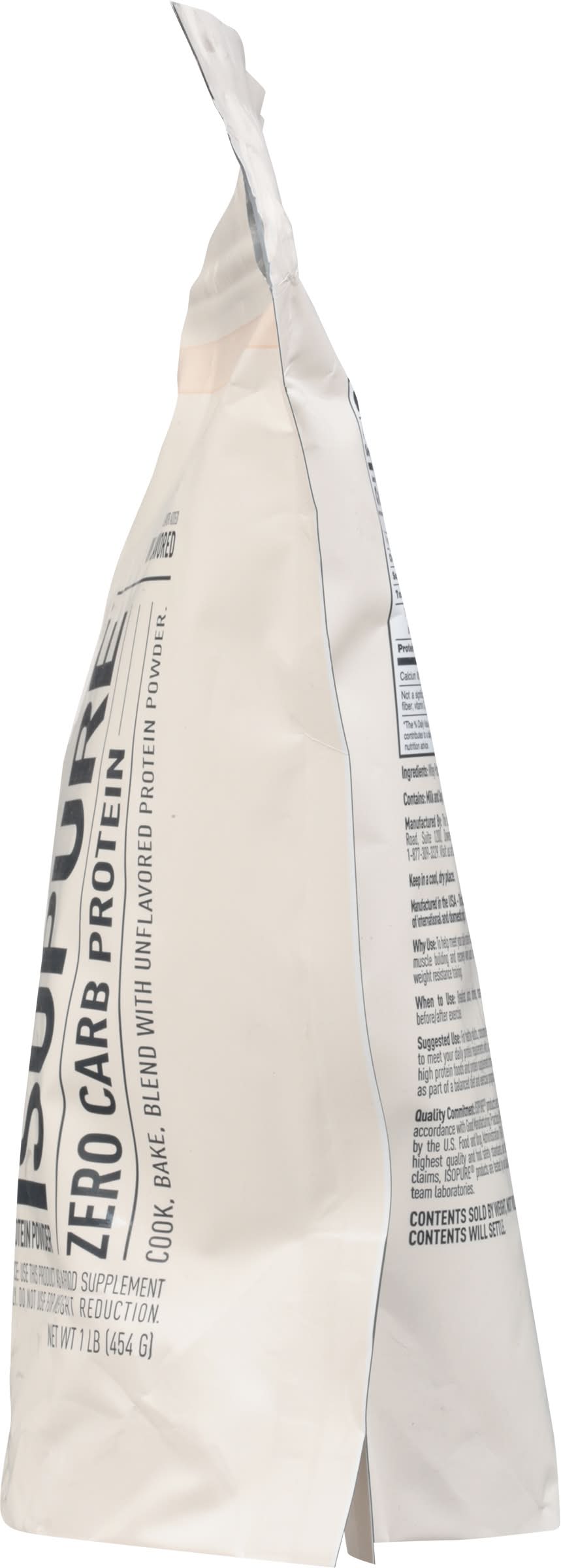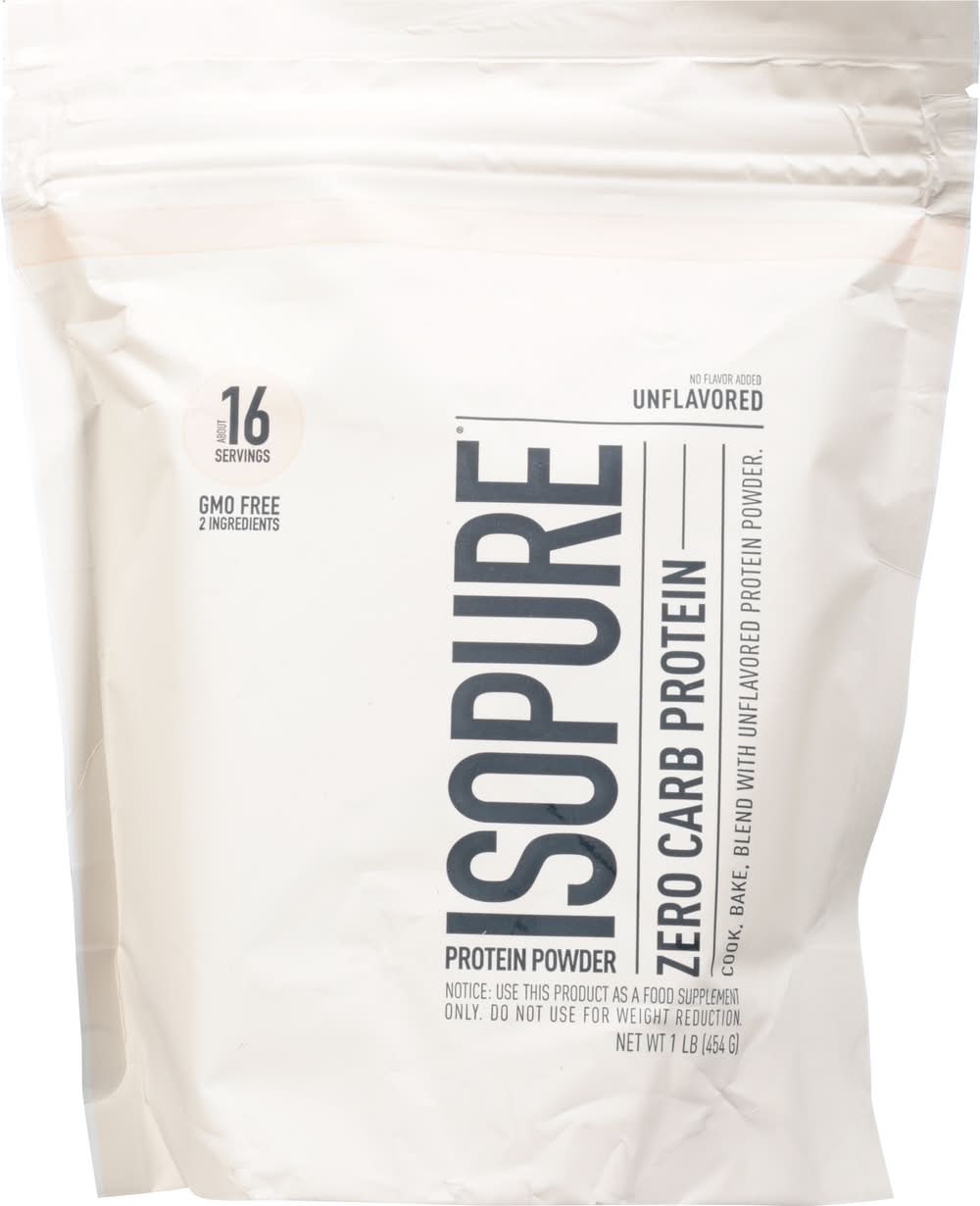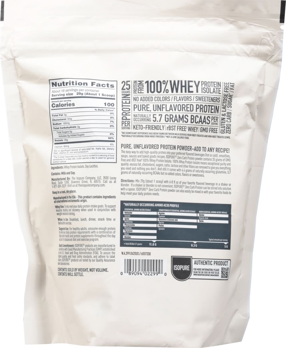 Cook, bake, blend with unflavored protein powder. No flavor added. 25 grams protein per serving. Naturally occurring 5.7 grams BCAAs per serving (Naturally occurring from whey protein). Keto-friendly. Gluten & lactose free. Zero carb / sugar (Not a low calorie food) / fat. No added colors / flavors / sweeteners. GMO free. About 16 servings. GMO free 2 ingredients. Zero carb protein. Protein from 100% whey protein isolate. Pure, unflavored protein. Pure, unflavored protein powder-add to any recipe! The easy way to add high-quality protein into your preferred flavored beverages (hot or cold), smoothies, soups, sauces and baked good recipes. Isopure Zero Carb Protein powder contains 25 grams of GMO free and rBST free (No significant difference has been found between milk derived from rBST-treated and non-rBST treated cows) 100% whey protein isolate. 100% whey protein isolate means exceptional purity and quality: excess fat, cholesterol, sugars, carbs, lactose and other fillers are removed to give you everything you need and nothing you don't. And still it comes with 4.4 grams of naturally occurring glutamine, 5.7 grams of naturally occurring BCAAs but no added colors, flavors or sweeteners. Authentic Product: For more information please scan the QR code or visit us at www.theisopurecompany.com/authentic. Quality Commitment: Isopure products are manufactured in accordance with Good Manufacturing Practices (GMP) established by the U.S. Food and Drug Administration (FDA). To assure the highest quality and food safety standards, and adhere to label claims, Isopure products are tested by our quality assurance team laboratories. theisopurecompany.com. Call us at 1-877-309-3329. Visit us at theisopurecompany.com. Contents sold by weight, not volume. Contents will settle. Manufactured in the USA - This product contains ingredients of international and domestic origin. • Size: 1 • Packaging: Reusable