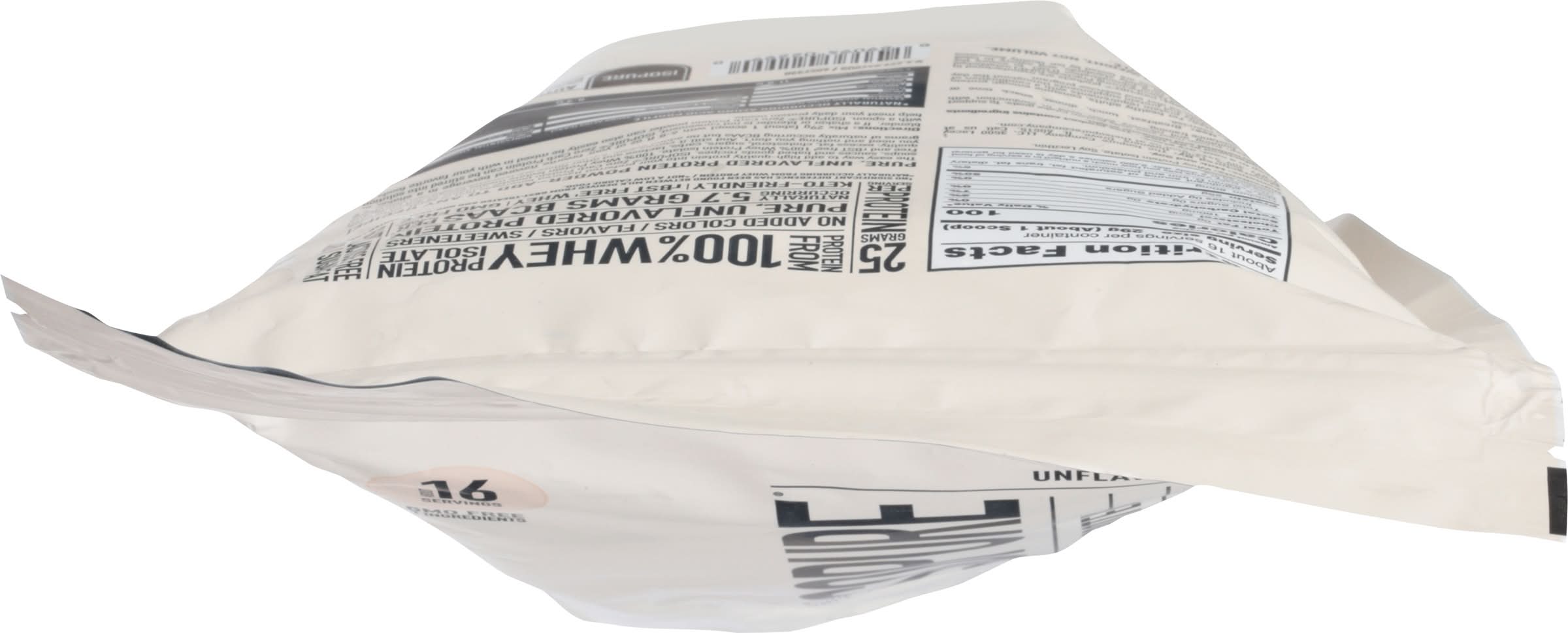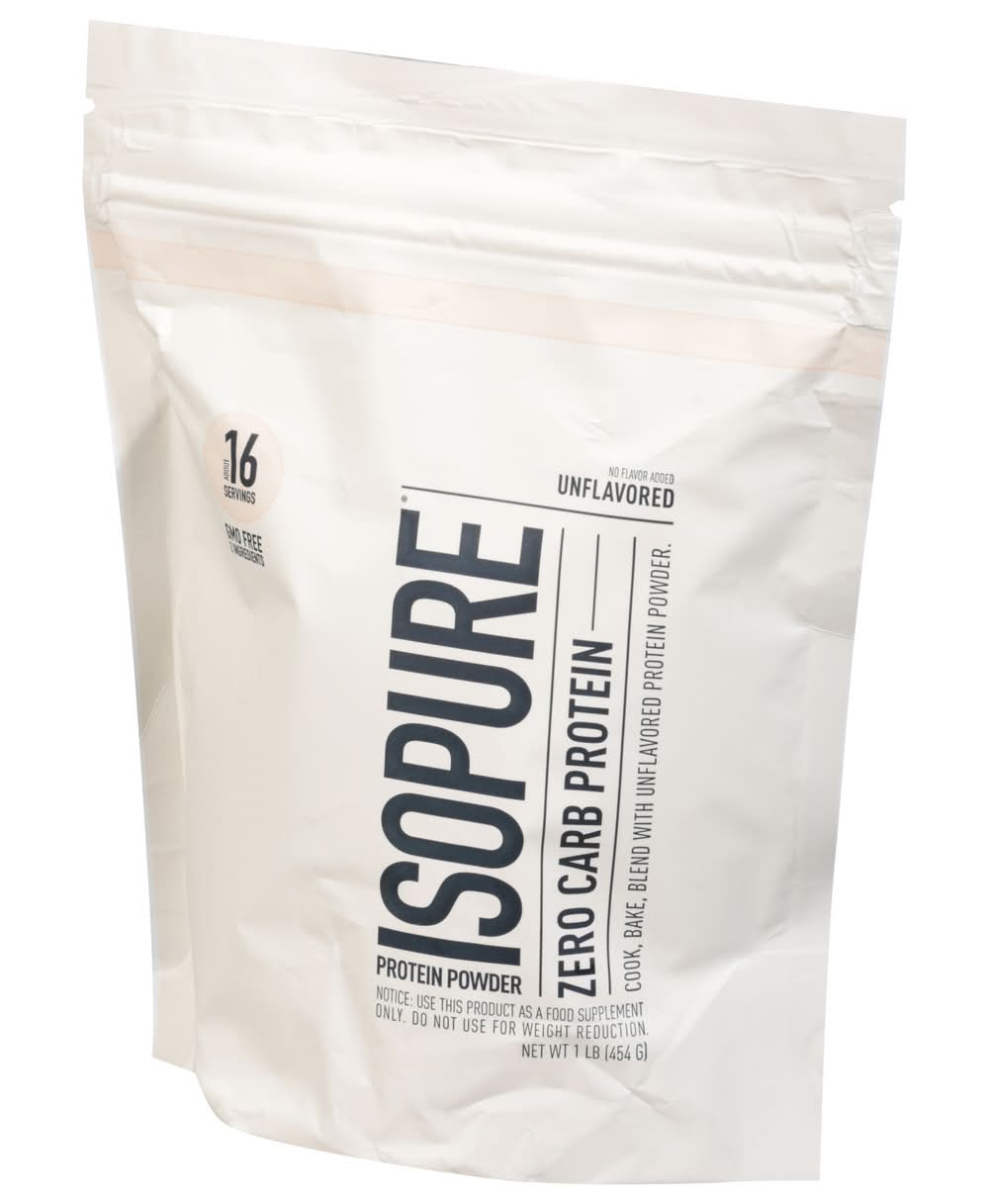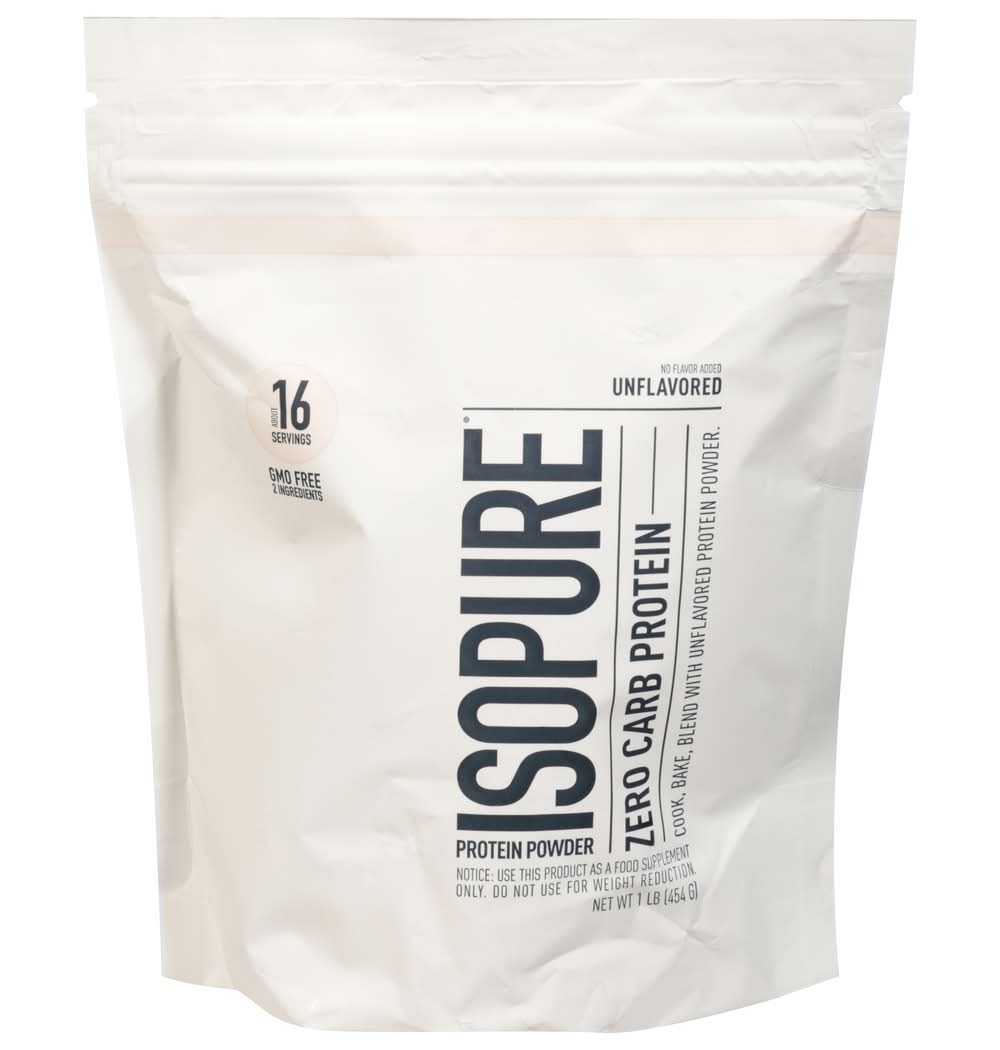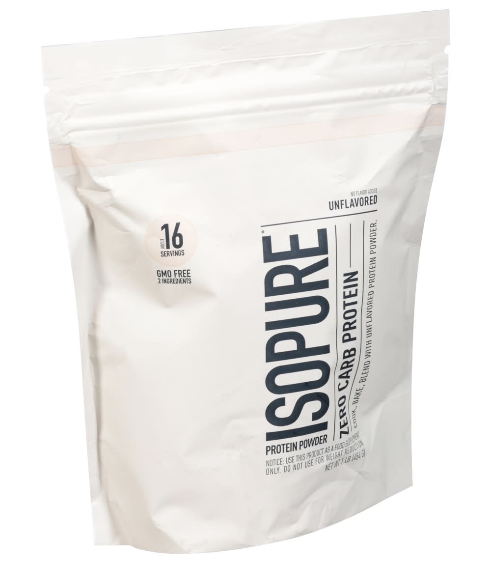 Cook, bake, blend with unflavored protein powder. No flavor added. 25 grams protein per serving. Naturally occurring 5.7 grams BCAAs per serving (Naturally occurring from whey protein). Keto-friendly. Gluten & lactose free. Zero carb / sugar (Not a low calorie food) / fat. No added colors / flavors / sweeteners. GMO free. About 16 servings. GMO free 2 ingredients. Zero carb protein. Protein from 100% whey protein isolate. Pure, unflavored protein. Pure, unflavored protein powder-add to any recipe! The easy way to add high-quality protein into your preferred flavored beverages (hot or cold), smoothies, soups, sauces and baked good recipes. Isopure Zero Carb Protein powder contains 25 grams of GMO free and rBST free (No significant difference has been found between milk derived from rBST-treated and non-rBST treated cows) 100% whey protein isolate. 100% whey protein isolate means exceptional purity and quality: excess fat, cholesterol, sugars, carbs, lactose and other fillers are removed to give you everything you need and nothing you don't. And still it comes with 4.4 grams of naturally occurring glutamine, 5.7 grams of naturally occurring BCAAs but no added colors, flavors or sweeteners. Authentic Product: For more information please scan the QR code or visit us at www.theisopurecompany.com/authentic. Quality Commitment: Isopure products are manufactured in accordance with Good Manufacturing Practices (GMP) established by the U.S. Food and Drug Administration (FDA). To assure the highest quality and food safety standards, and adhere to label claims, Isopure products are tested by our quality assurance team laboratories. theisopurecompany.com. Call us at 1-877-309-3329. Visit us at theisopurecompany.com. Contents sold by weight, not volume. Contents will settle. Manufactured in the USA - This product contains ingredients of international and domestic origin. • Size: 1 • Packaging: Reusable