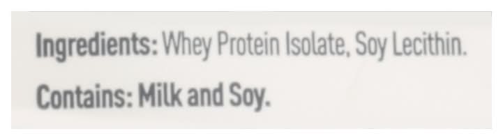 Ingredients: Whey Protein Isolate, Soy Lecithin. Naturally Occurring Amino Acid Profile: Essential Amino Acids [EAAs]: Isoleucine; Leucine; Lysine; Methionine; Phenylalanine; Threonine; Tryptophan; Valine; Histidine. Conditionally Essential Amino Acids (CAAs): Arginine; Cysteine; Glutamine & Glutamic Acid; Glycine; Proline; Tyrosine. NonEssential Amino Acids (NAAs): Alanine; Aspartic Acid; Serine. Total BCAAs 5.7 grams; 11.8 g; 8.3 Contains: Milk, Soybeans