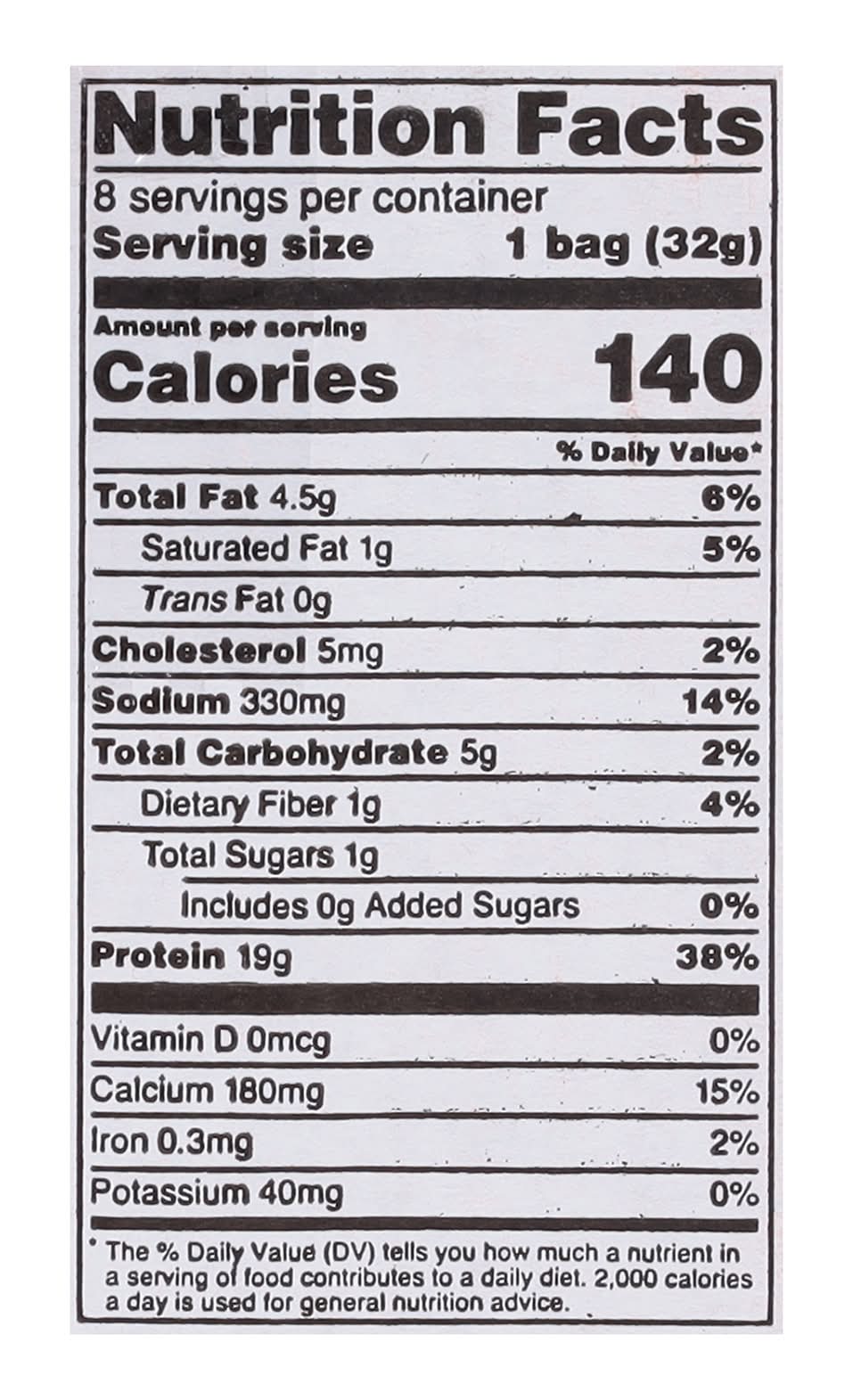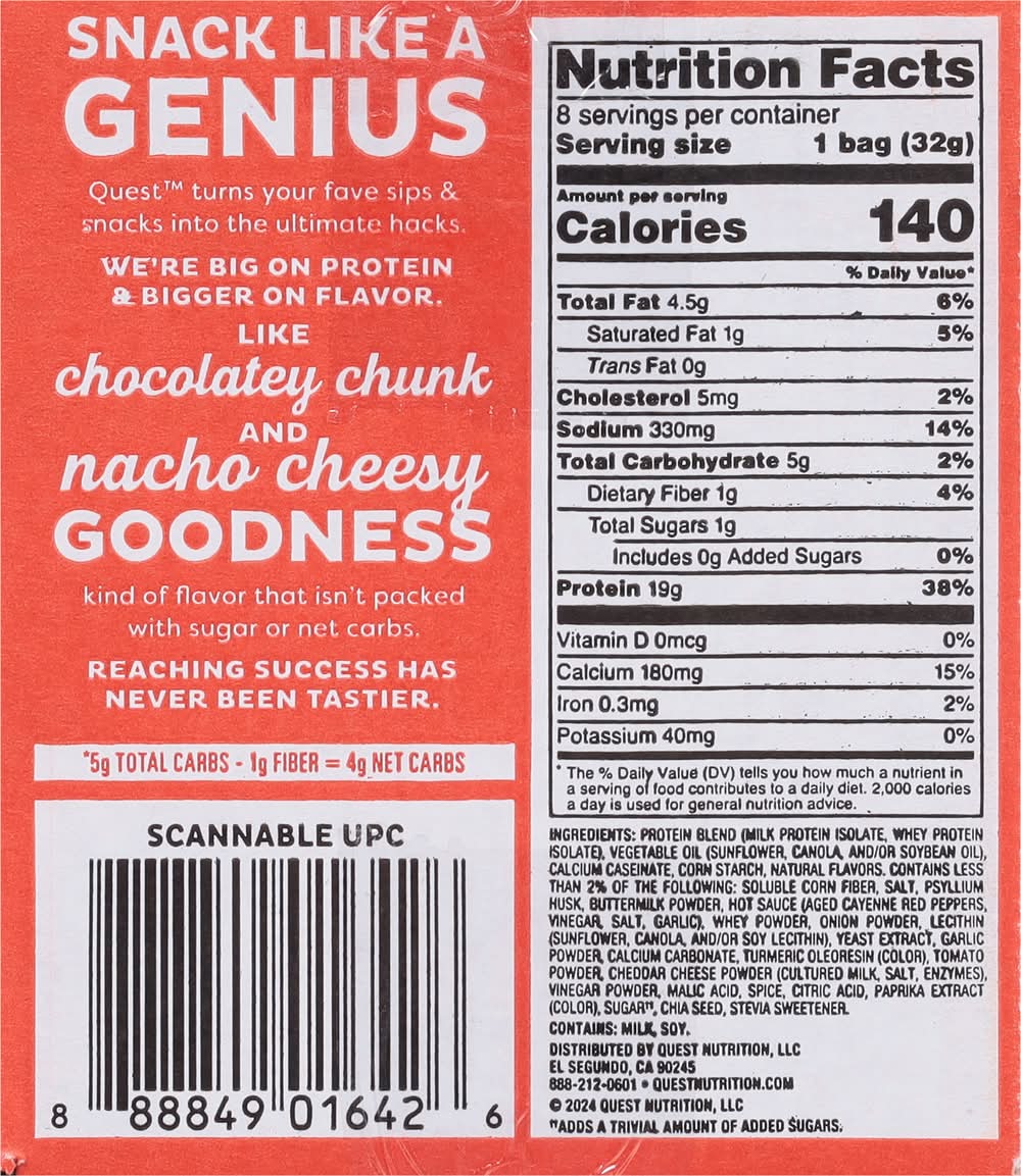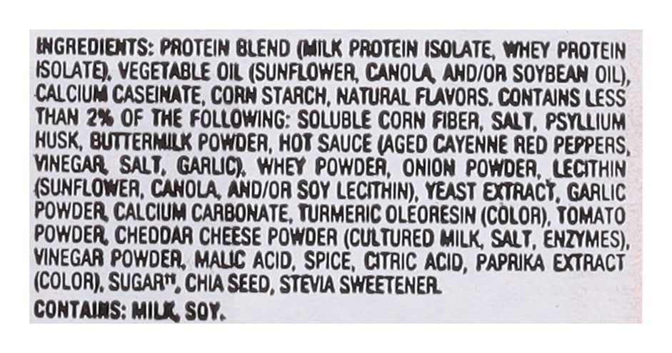 Ingredients: Protein Blend (Milk Protein Isolate, Whey Protein Isolate), Vegetable Oil (Sunflower, Canola, and/or Soybean Oil), Calcium Caseinate, Corn Starch, Natural Flavors, Contains Less than 2% of the Following: Soluble Corn Fiber, Salt, Psyllium Husk, Buttermilk Powder, Hot Sauce (Aged Cayenne Red Peppers, Vinegar, Salt, Garlic), Whey Powder, Onion Powder, Lecithin (Sunflower, Canola, and/or Soy Lecithin), Yeast Extract, Garlic Powder, Calcium Carbonate, Turmeric Oleoresin (Color), Tomato Powder, Cheddar Cheese Powder (Cultured Milk, Salt, Enzymes), Vinegar Powder, Malic Acid, Spice, Citric Acid, Paprika Extract (Color), Sugar(a), Chia Seed, Stevia Sweetener. (a) Adds a Trivial Amount of Added Sugars Contains: Milk, Soybeans