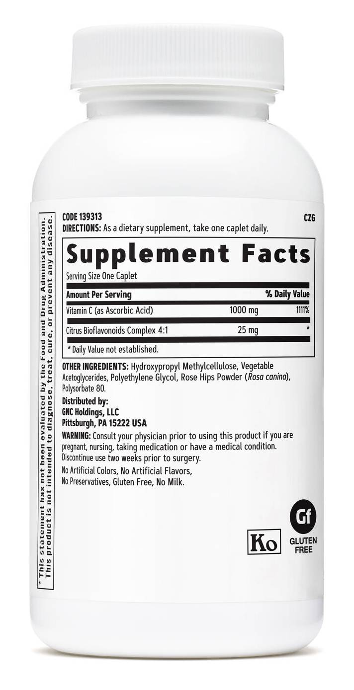 GNC Vitamin C Time-Released - 1000 mg: Immune Support GNC Vitamin C Time-Released is a protective antioxidant that provides immune support. This dietary supplement includes citrus bioflavonoids. 90 vegetarian caplets, 90 servings Gluten free & kosher No sugar, starch, preservatives, wheat, corn, soy, or dairy No artificial colors or flavors Sodium free Size: 1