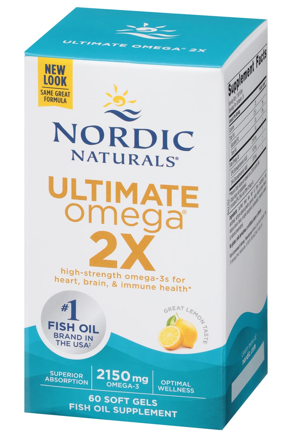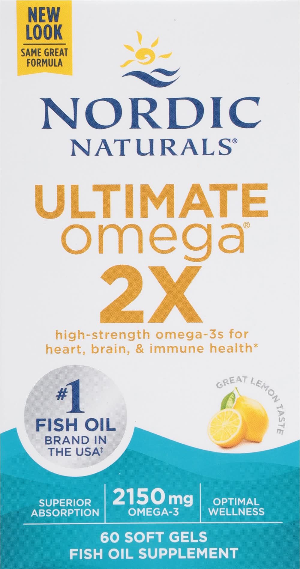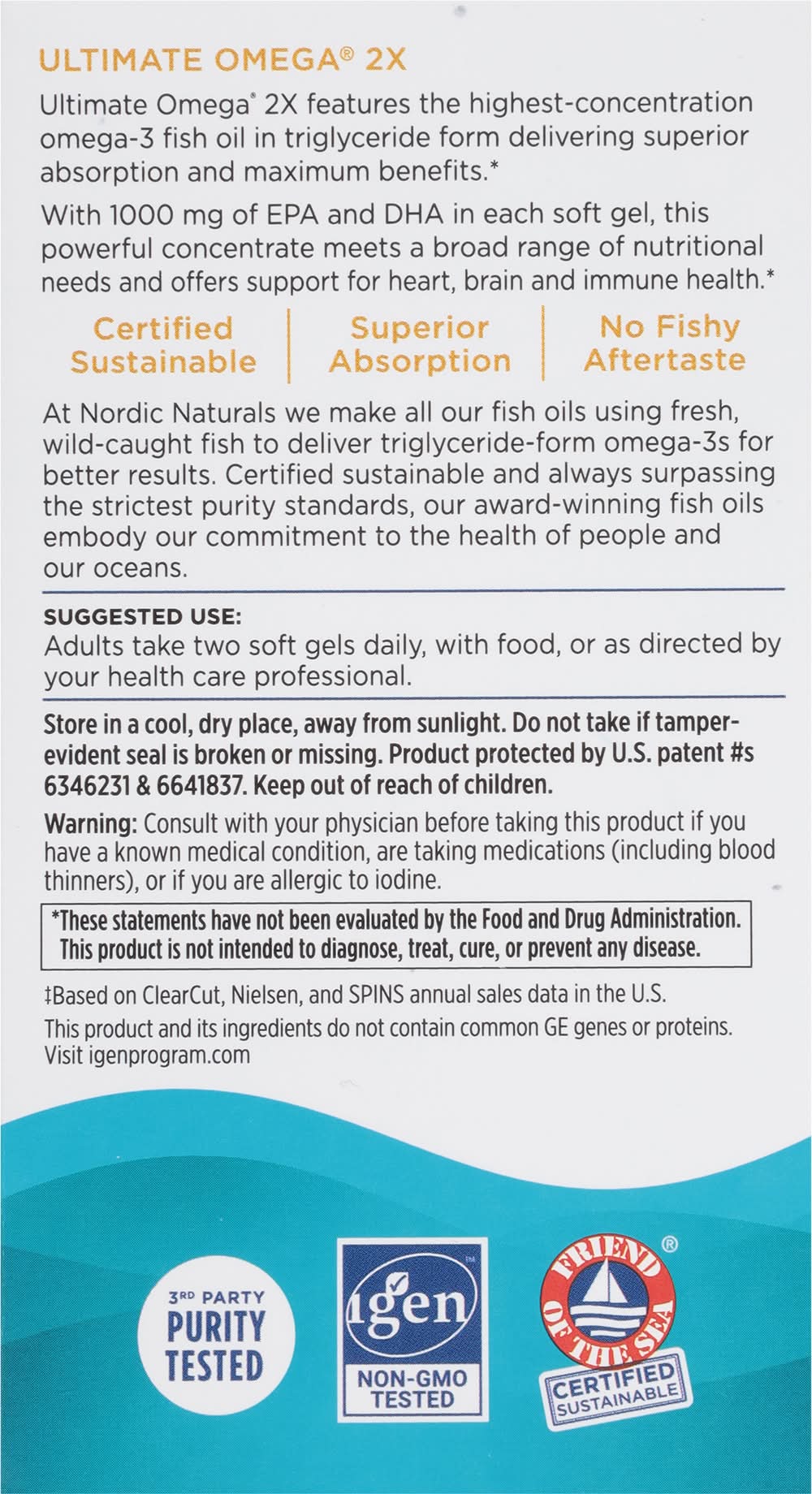Fish Oil Supplement. 2150 mg omega-3. No artificial colors or flavors. No gluten, milk derivatives. Igen: Non-GMO Tested. This product and its ingredients do not contain common GE genes or proteins. Visit igenprogram.com. New look. Same great formula. 2X high-strength omega-3s for heart, brain, & immune health. No.1 Fish oil brand in the USA (Based on ClearCut, Nielsen, and SPINS annual sales data in the U.S.). Great lemon taste. Ultimate Omega 2X features the highest-concentration omega-3 fish oil in triglyceride form delivering superior absorption and maximum benefits. With 1000 mg of EPA and DHA in each soft gel, this powerful concentrate meets a broad range of nutritional needs and offers support for heart, brain and immune health. Certified sustainable. No fishy aftertaste. At Nordic Naturals we make all our fish oils using fresh, wild-caught fish to deliver triglyceride-form omega-3s for better results. Certified sustainable and always surpassing the strictest purity standards, our award-winning fish oils embody our commitment to the health of people and our oceans. The Nordic Promise: Superior Quality: From ingredient sourcing and product creation to shipping and customer care, superior quality is how we always deliver the best essential nutrients. Made with Integrity: Our products are grounded in science, formulated with care, and responsibly sourced for your family's health and peace of mind. 3rd Party purity tested. nordic.com. igenprogram.com. Product Transparency: Scan the QR code to check your product's test results and see for yourself why so many people love Nordic Naturals. Learn more at nordic.com. Friend of the Sea Certified. Please recycle this container. (These statements have not been evaluated by the Food and Drug Administration. This product is not intended to diagnose, treat, cure, or prevent any disease.) Fish oil processed in Norway. Manufactured in the U.S. • Nordic Naturals Mfg., 111 Jennings Drive, Watsonville, CA 95076 • Packaging: Reusable