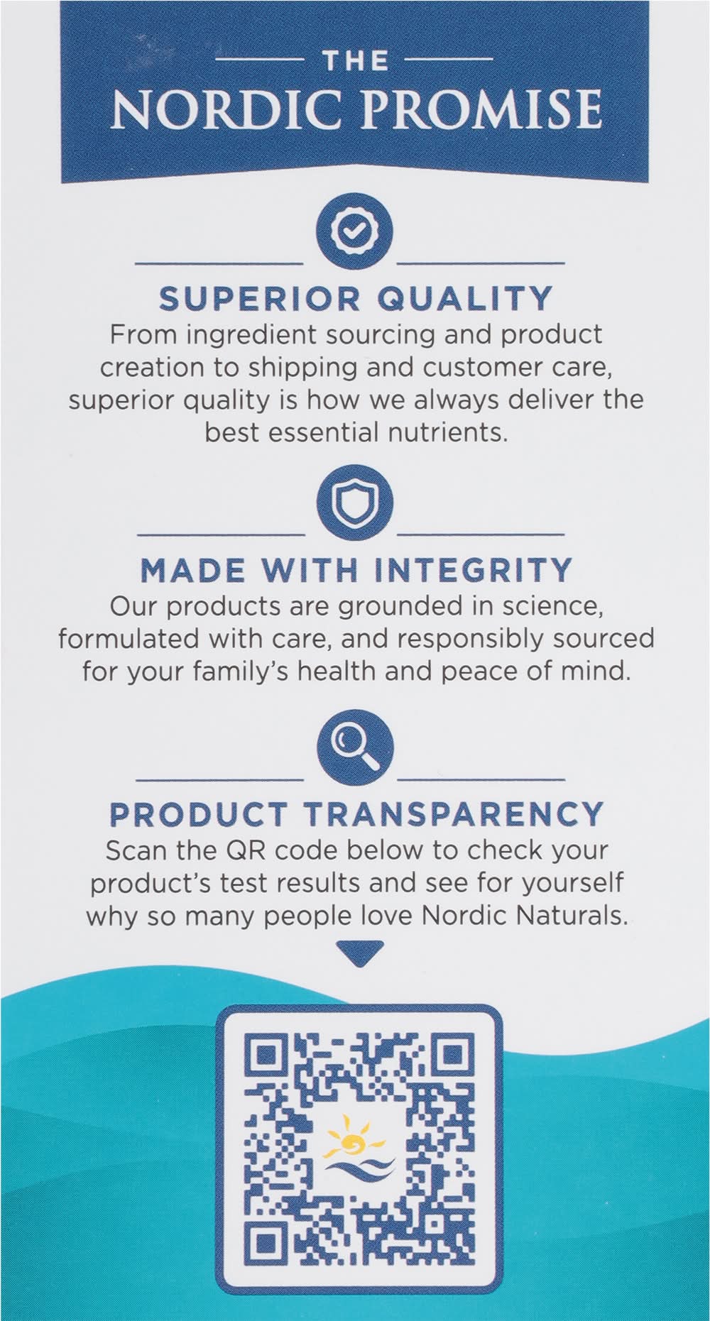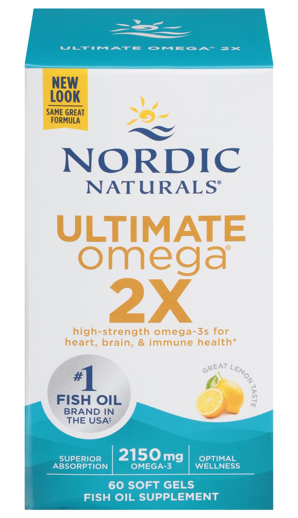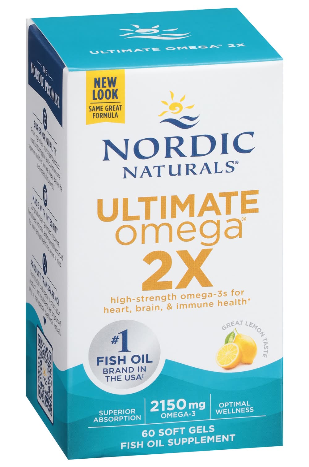 Fish Oil Supplement. 2150 mg omega-3. No artificial colors or flavors. No gluten, milk derivatives. Igen: Non-GMO Tested. This product and its ingredients do not contain common GE genes or proteins. Visit igenprogram.com. New look. Same great formula. 2X high-strength omega-3s for heart, brain, & immune health. No.1 Fish oil brand in the USA (Based on ClearCut, Nielsen, and SPINS annual sales data in the U.S.). Great lemon taste. Ultimate Omega 2X features the highest-concentration omega-3 fish oil in triglyceride form delivering superior absorption and maximum benefits. With 1000 mg of EPA and DHA in each soft gel, this powerful concentrate meets a broad range of nutritional needs and offers support for heart, brain and immune health. Certified sustainable. No fishy aftertaste. At Nordic Naturals we make all our fish oils using fresh, wild-caught fish to deliver triglyceride-form omega-3s for better results. Certified sustainable and always surpassing the strictest purity standards, our award-winning fish oils embody our commitment to the health of people and our oceans. The Nordic Promise: Superior Quality: From ingredient sourcing and product creation to shipping and customer care, superior quality is how we always deliver the best essential nutrients. Made with Integrity: Our products are grounded in science, formulated with care, and responsibly sourced for your family's health and peace of mind. 3rd Party purity tested. nordic.com. igenprogram.com. Product Transparency: Scan the QR code to check your product's test results and see for yourself why so many people love Nordic Naturals. Learn more at nordic.com. Friend of the Sea Certified. Please recycle this container. (These statements have not been evaluated by the Food and Drug Administration. This product is not intended to diagnose, treat, cure, or prevent any disease.) Fish oil processed in Norway. Manufactured in the U.S. • Nordic Naturals Mfg., 111 Jennings Drive, Watsonville, CA 95076 • Packaging: Reusable