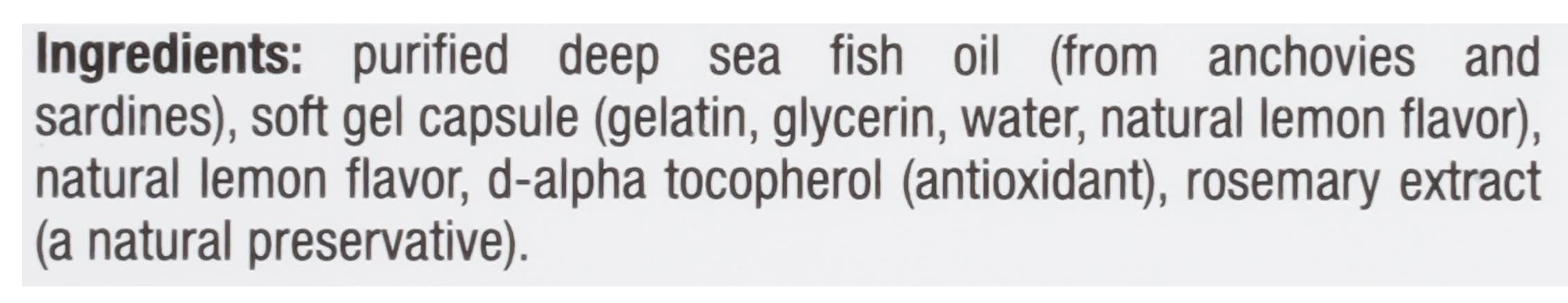 Ingredients: Purified Deep Sea Fish Oil (from Anchovies and Sardines), Soft Gel Capsule (Gelatin Glycerin Water Natural Lemon Flavor), Natural Lemon Flavor, D-Alpha Tocopherol (Antioxidant), Rosemary Extract (a Natural Preservative) Contains: Fish