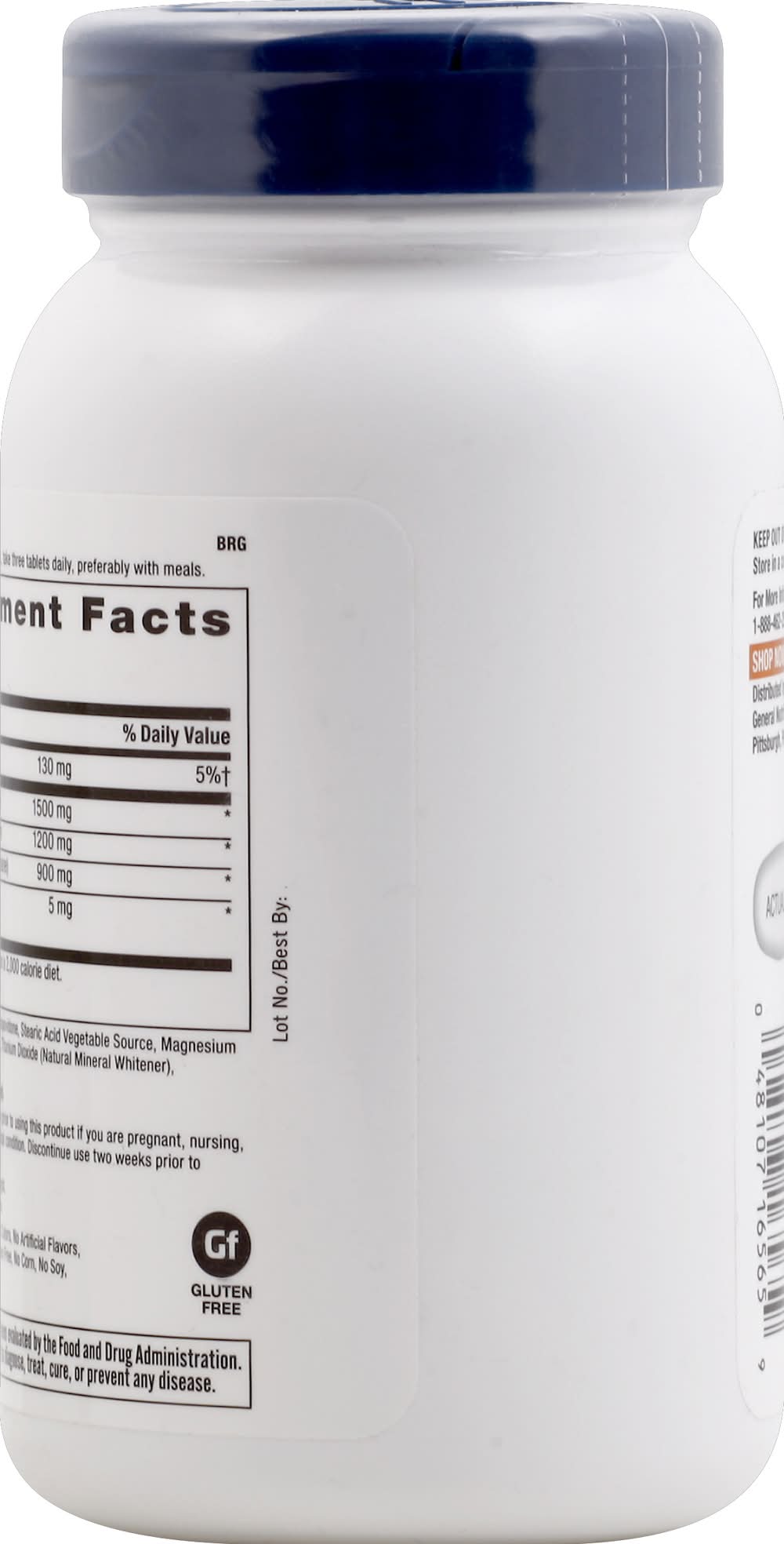 Ingredients: Other Ingredients: Cellulose, Crospovidone, Steam Acid Vegetable Source, Magnesium Stearate Vegetable Source, Silica, Titanium Dioxide (Natural Mineral Whitener), Polyethylene Glycol, Talc Contains: 'Free From Milk', 'Free From Soybeans', 'Free From Wheat', 'Free From Gluten'