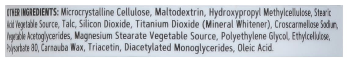 Ingredients: Other Ingredients: Microcrystalline Cellulose, Maltodextrin, Hydroxypropyl Methylcellulose, Stearic Acid Vegetable Source, Talc, Silicon Dioxide, Titanium Dioxide (Mineral Whitener), Croscarmellose Sodium, Vegetable Acetoglycerides, Magnesium Stearate Vegetable Source, Polyethylene Glycol, Ethylcellulose, Polysorbate 80, Carnauba Wax, Triacetin, Diacetylated Monoglycerides, Oleic Acid
