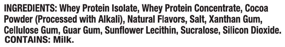 Ingredients: Whey Protein Isolate, Whey Protein Concentrate, Cocoa Powder (Processed with Alkali), Natural Flavors, Salt, Xanthan Gum, Cellulose Gum, Guar Gum, Sunflower Lecithin, Sucralose, Silicon Dioxide Contains: Milk