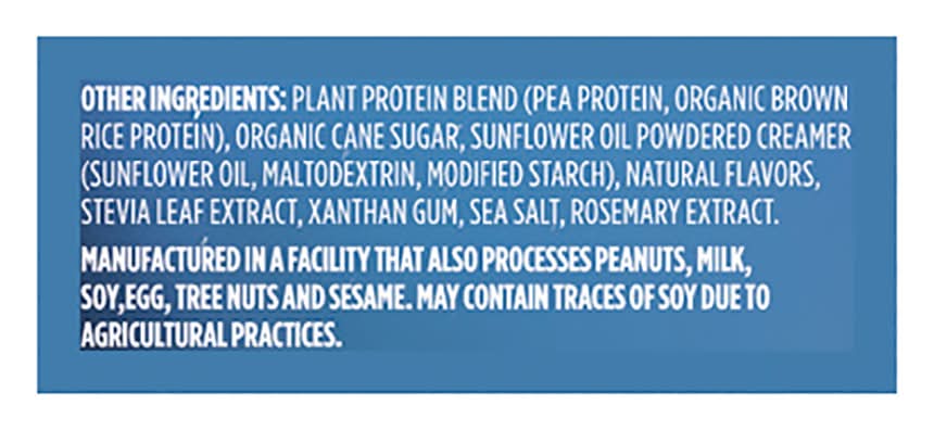 Ingredients: Other Ingredients: Plant Protein Blend (Pea Protein, Organic Brown Rice Protein), Organic Cane Sugar, Sunflower Oil Powdered Creamer (Sunflower Oil, Maltodextrin, Modified Starch), Natural Flavors, Stevia Leaf Extract, Xanthan Gum, Sea Salt, Rosemary Extract Contains: Peanuts, Milk, Soybeans, Eggs, Tree Nuts, Sesame