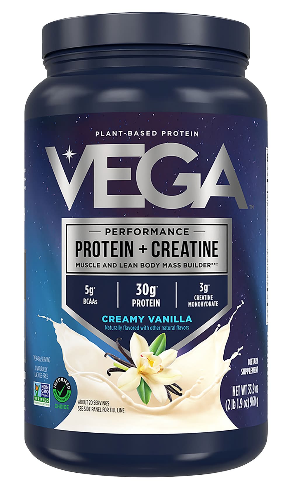 Vega - Performance Protein + Creatine - Creamy Vanilla - 20 Servings Your ultimate muscle growth & lean body mass formula Performance: Power your journey with vega protein + creatine, scientifically formulated with proven ingredients you need to reach your athletic goals Protein For Peak Performance: Crucial for building lean muscle, get 30g of our multi-source, plant-based protein blend, naturally lactose-free. Make your Workouts Count: Enhance strength and exercise performance while supporting lean body mass with 3g of creatine. Fuel For Strong Repeatability: Enjoy more days in the gym by fueling your recovery with our formula containing at least 5g BCAAs and 10g EAAs  • 5g BCAAs • 30g Protein • 3g Creatine Monohydrate • Vegan • Gluten Free • No Artificial Flavor or Preservatives Size: 1