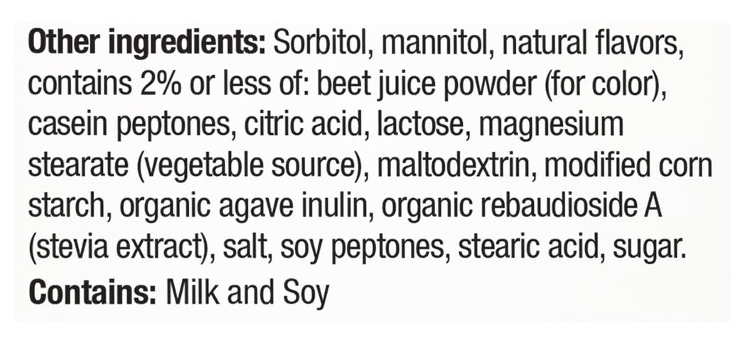 Ingredients: Other Ingredients: Sorbitol, Mannitol, Natural Flavors, Contains 2% or Less of: Beet Juice Powder (for Color), Casein Peptones, Citric Acid, Lactose, Magnesium Stearate (Vegetable Source), Maltodextrin, Modified Corn Starch, Organic Agave Inulin, Organic Rebaudioside A (Stevia Extract), Salt, Soy Peptones, Stearic Acid, Sugar Contains: Milk, Soybeans, Lactose