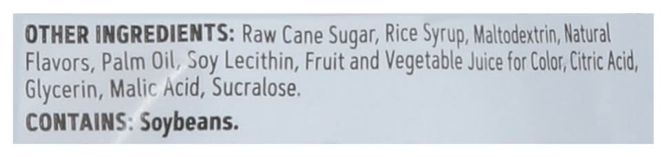 Ingredients: Raw Cane Sugar, Rice Syrup, Maltodextrin, Natural Flavors, Palm Oil, Soy Lecithin, Fruit and Vegetable Juice for Color, Citric Acid, Glycerin, Malic Acid, Sucralose Contains: Soybeans