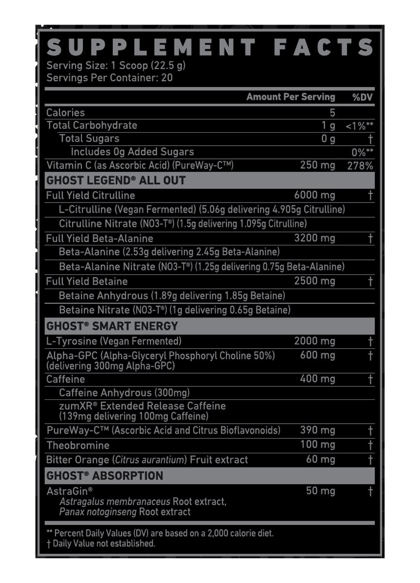 Ingredients: Ghost Legend All Out: Full Yield Citrulline: L-Citrulline (Vegan Fermented) (5.06 g Delivering 4, 905 g Citrulline), Citrulline Nitrate (N03-T) (1.5 g Delivering 1, 095 g Citrulline). Full Yield Beta-Alanine: Beta-Alanine (2.53 g Delivering 2.45 g Beta-Alanine), Beta-Alanine Nitrate (N03-T) (1.25 g Delivering 0.75 g Beta-Alanine). Full Yield Betaine: Betaine Anhydrous (1.89 g Delivering 1.85 g Betaine), Betaine Nitrate (N03-T) (1 g Delivering 0.65 g Betaine). Ghost Smart Energy: L-Tyrosine (Vegan Fermented), Alpha-GPC (Alpha-Glyceryl Phosphoryl Choline 50%) (Delivering 300 mg Alpha-GPC), Caffeine: Caffeine Anhydrous (300 mg), zumXR Extended Release Caffeine (139 mg Delivering 100 mg Caffeine), Pureway-C (Ascorbic Acid and Citrus Bioflavonoids), Theobromine, Bitter Orange (Citrus Aurantium) Fruit Extract. Ghost Absorption: Astragin: Astragalus Membranaceus Root Extract, Panax Notoginseng Root Extract. Other Ingredients: Malic Acid, Natural and Artificial Flavors, Citric Acid, Tartaric Acid, Magnesium Oxide, Silicon Dioxide, Calcium Silicate, Sucralose, Spirulina Powder (for Color), Turmeric Root Powder (for Color)